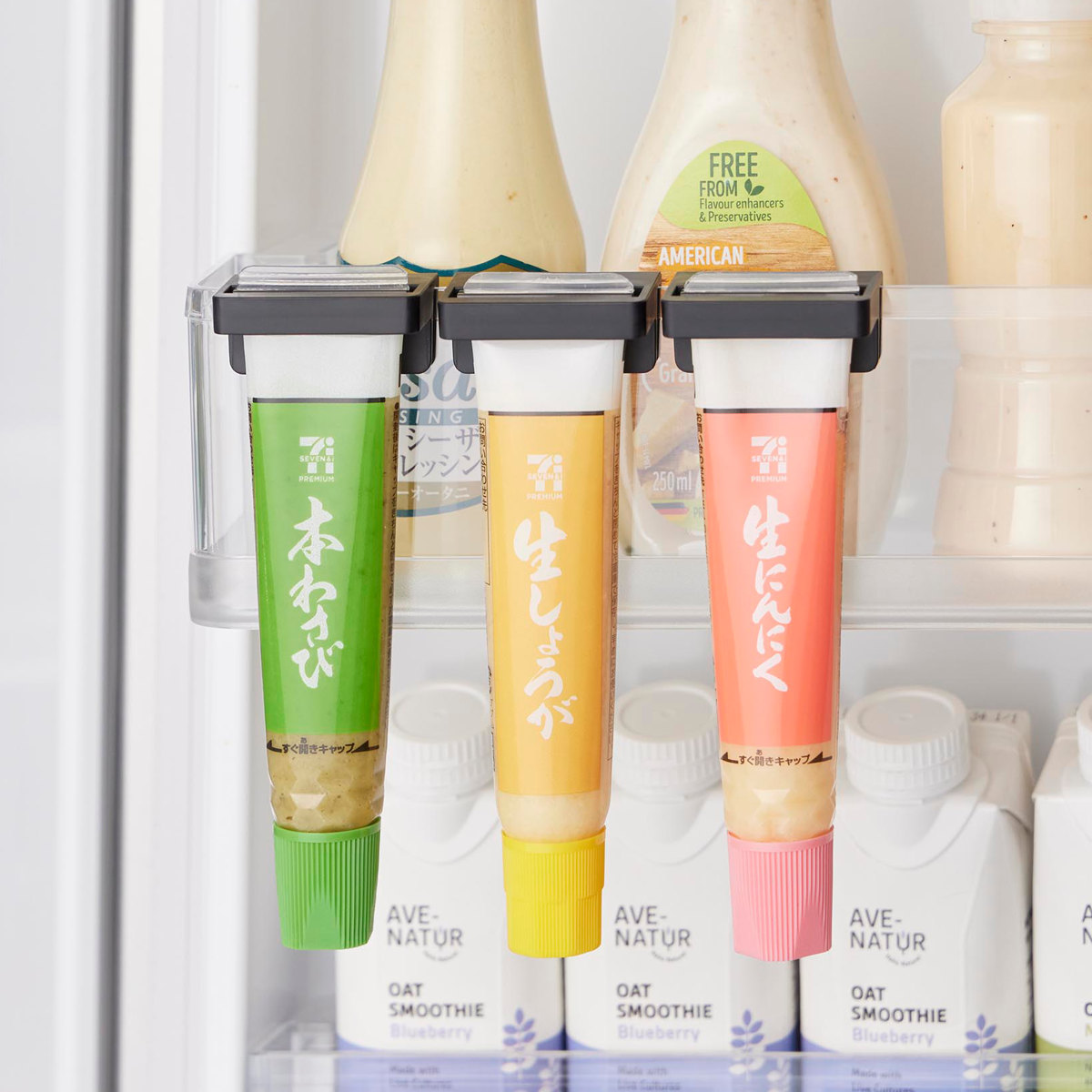 薬味チューブを並べて掛けられる便利な3個組です。わさび、しょうが、にんにく、からしなど分けて並べられるので、使いたいものがすぐに見つかり、料理の準備もスムーズに。