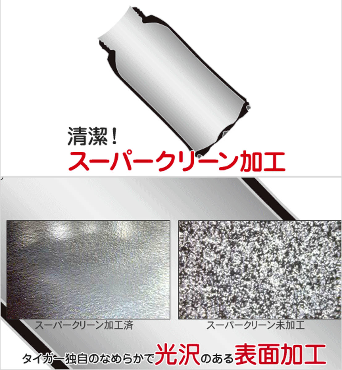 ボトルの内面には、なめらかで光沢のあるスーパークリーン加工を施しました。汚れもニオイもつきにくく、さっと洗うだけで、いつも清潔にお使いいただけます。