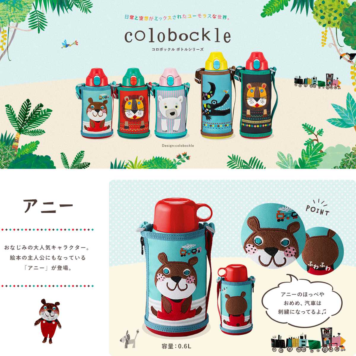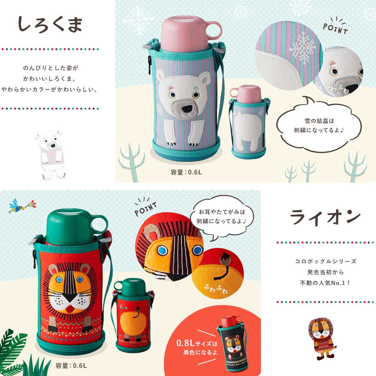 ユーモラスな世界観が魅力の「colobockle(コロボックル)」シリーズの真空断熱ボトル。2種類のユニット付きで、飲み口を付け替えるだけでダイレクト&コップの2WAYでご使用いいただけます。