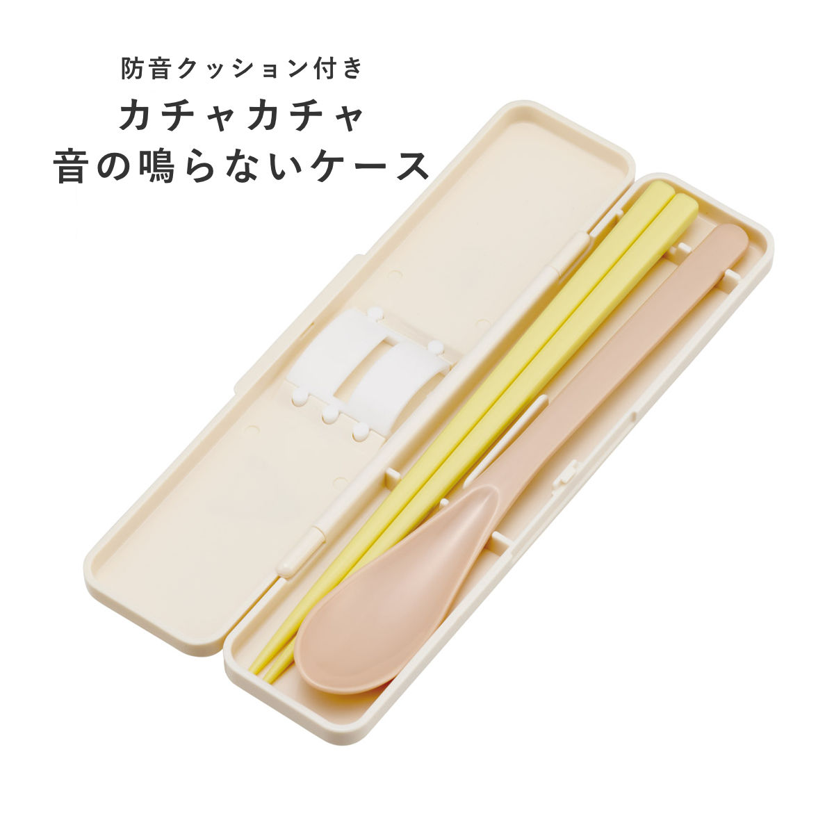 カトラリーを持ち運ぶときに、ケースにあたってカチャカチャ音が鳴りにくいようにケースの中に防音クッションが付いています。クッションがスプーンとお箸をしっかり押さえ、上下左右に動かないので音が鳴りにくい仕様です。