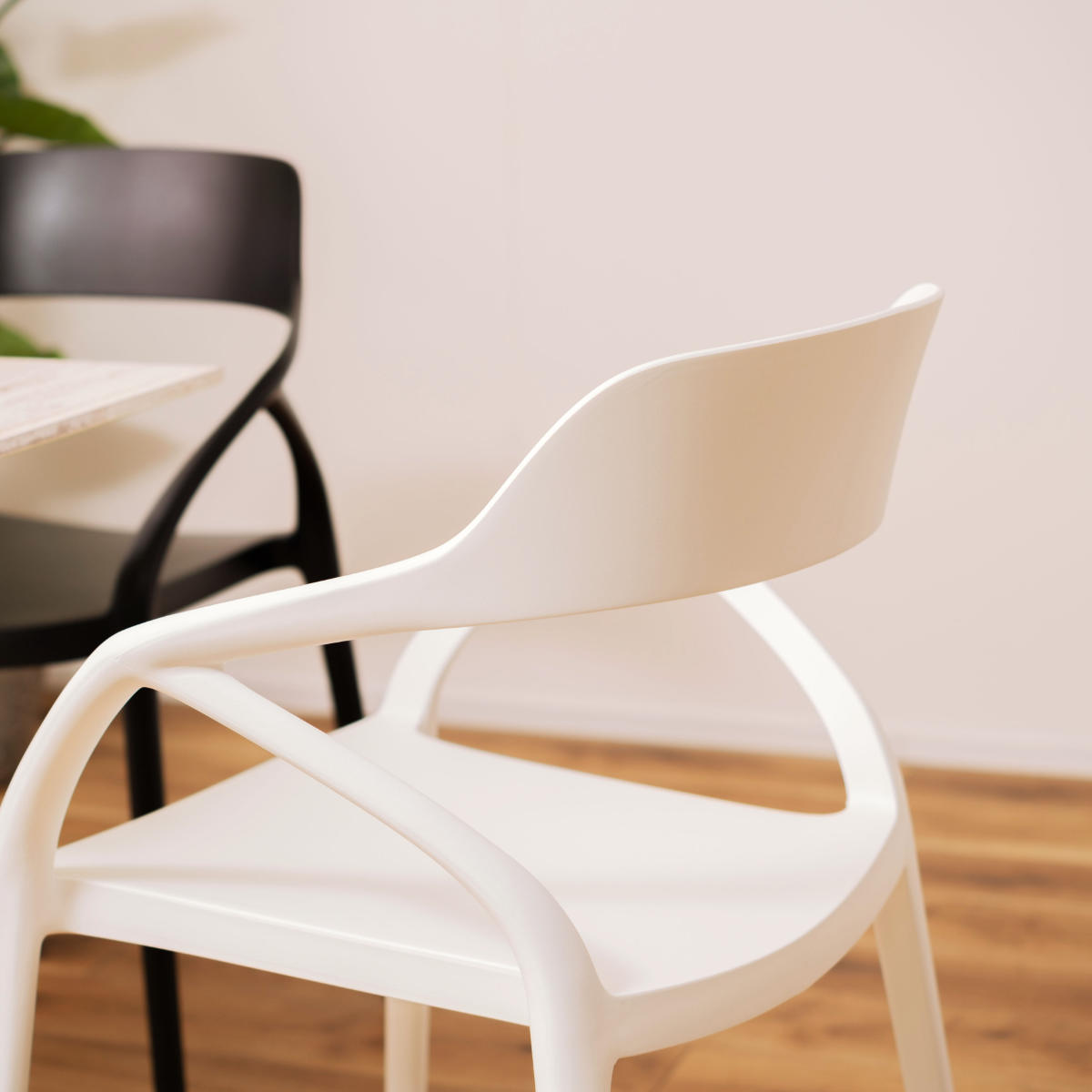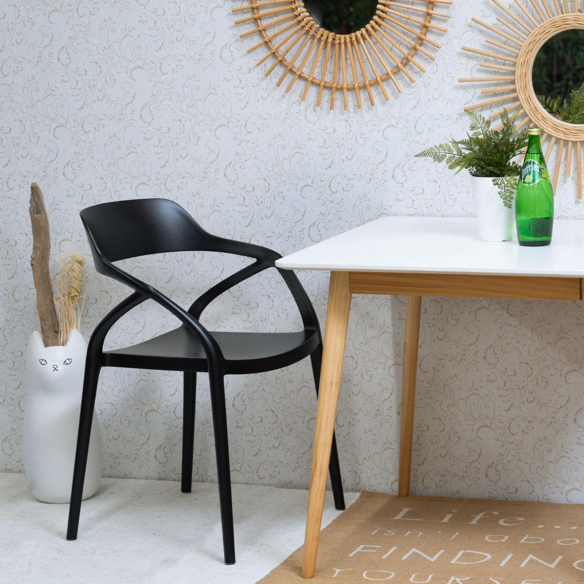 無駄のないスタイリッシュなフォルムが魅力のアーム付きチェア。曲線を活かしたデザインとポリプロピレン製の軽やかさで、どんな空間にもすっと馴染む使いやすい一脚です。