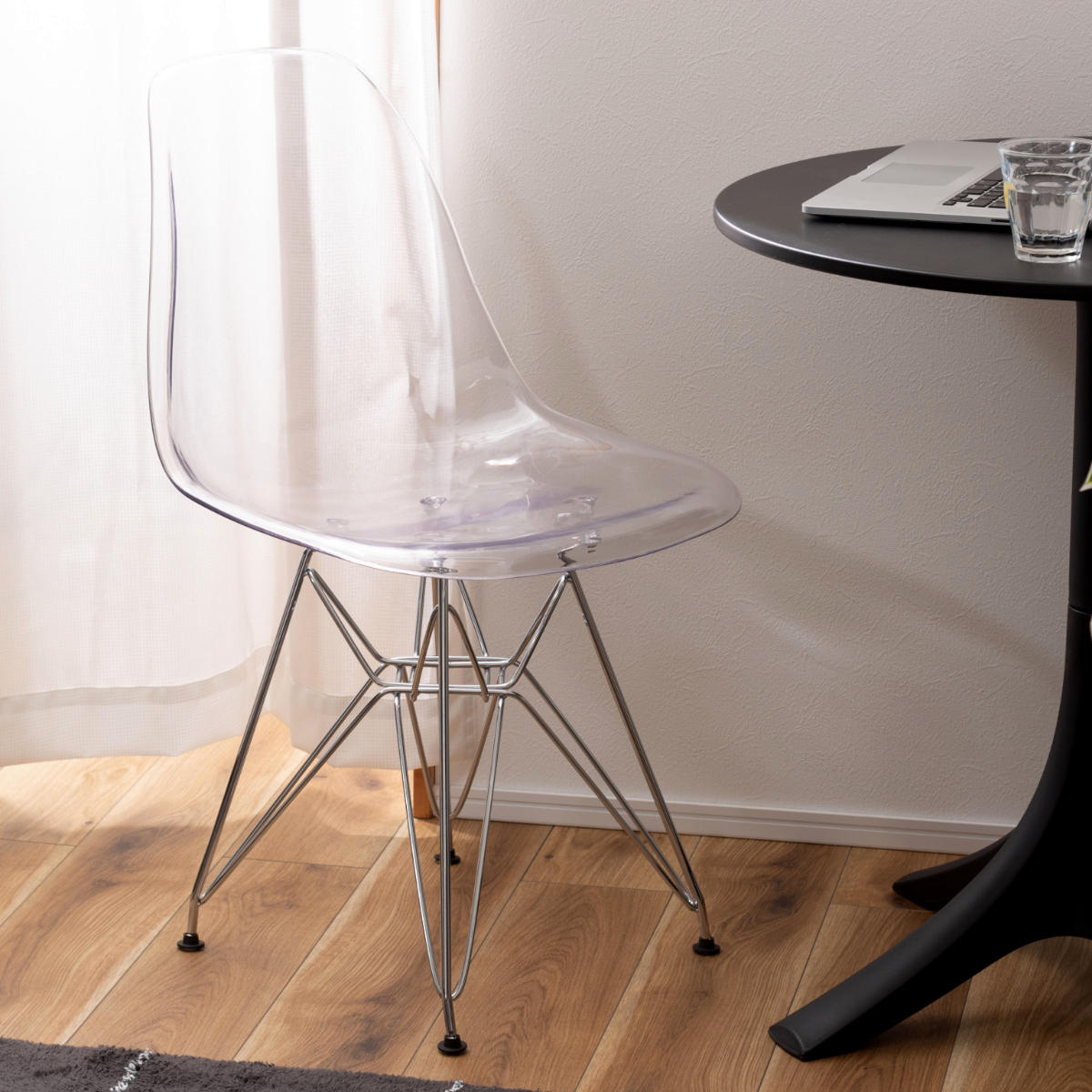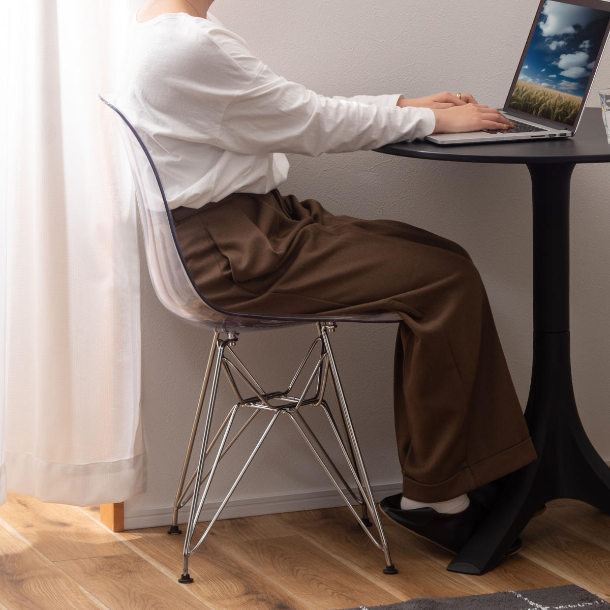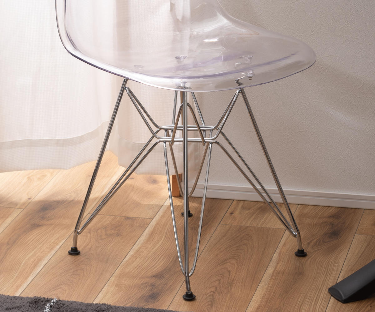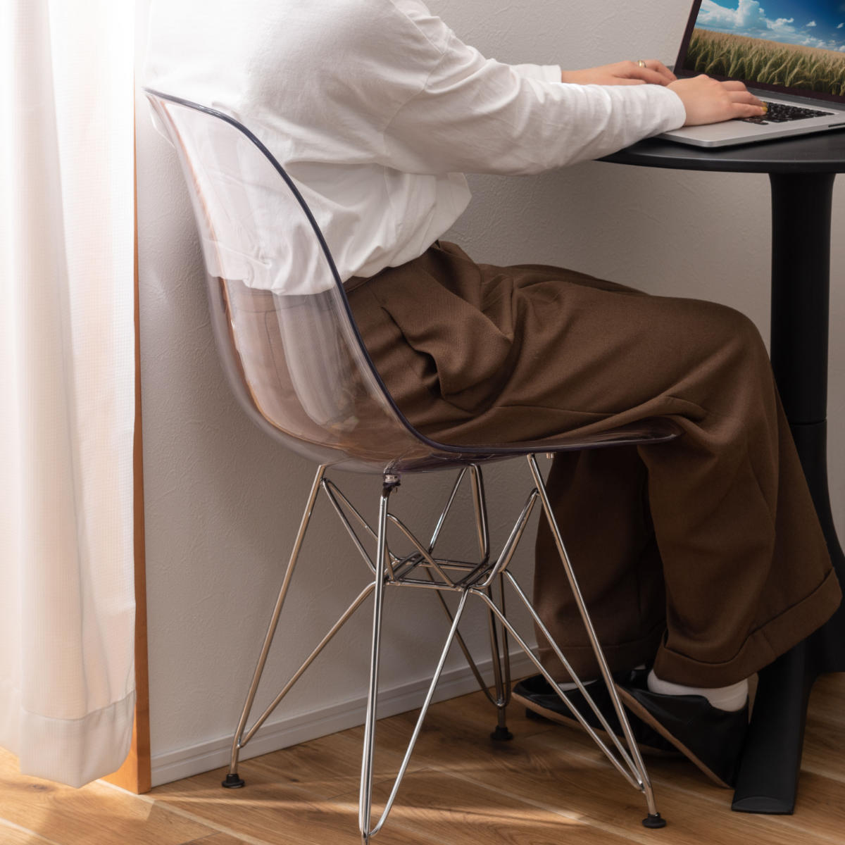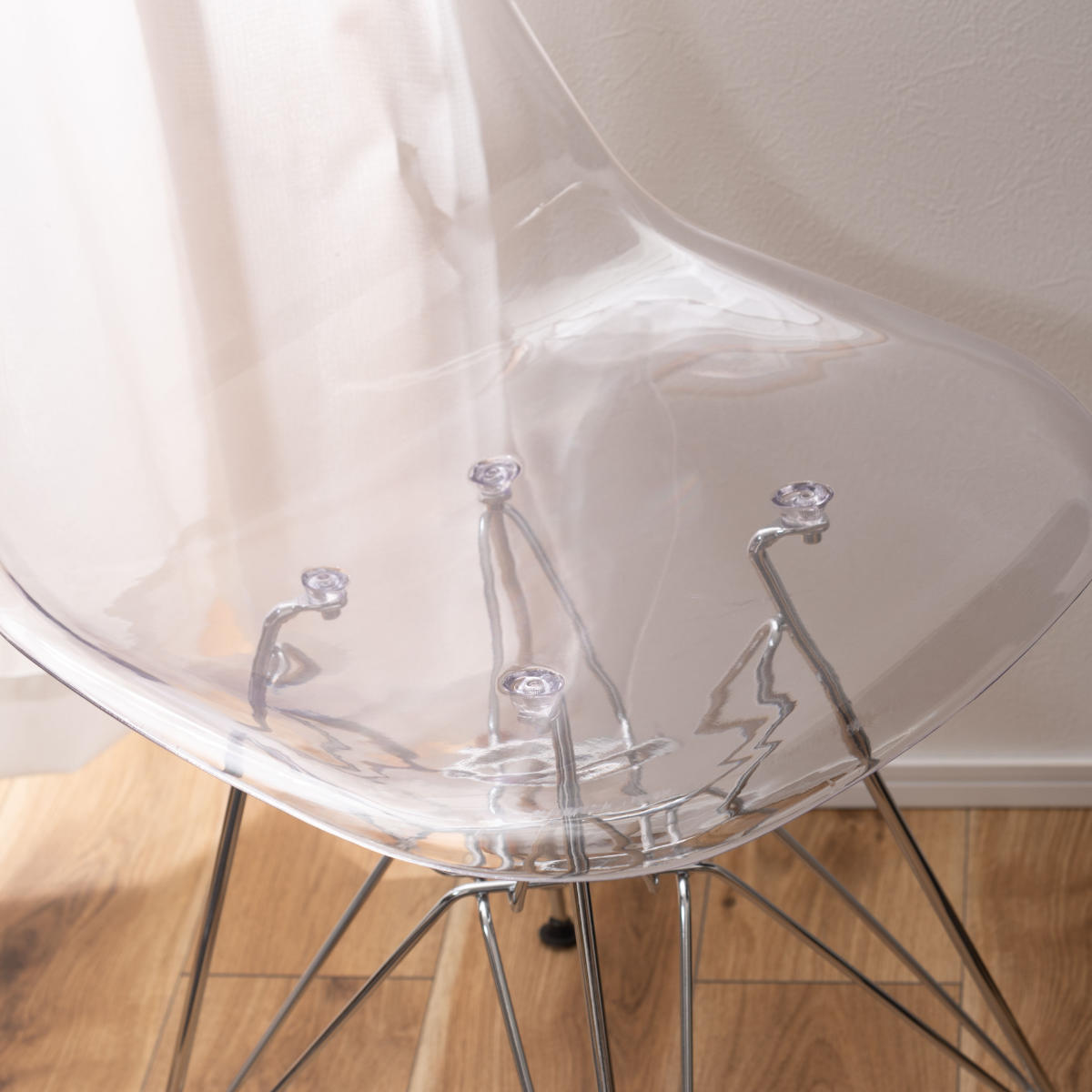 クリア座面×細身スチール脚の組み合わせにより、視界を遮らず空間を広く見せてくれます。リビング・ダイニング・ワークスペースなど、どんな場所でも合わせやすい万能チェアです。