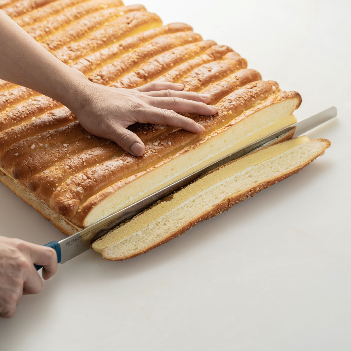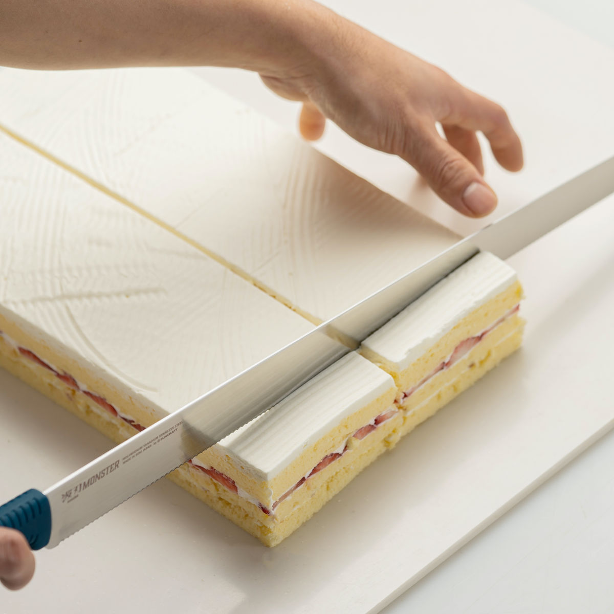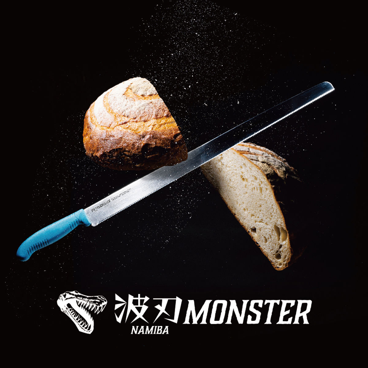 プロのパン職人やパティシエ向けに設計されたパン切り包丁シリーズ「波刃モンスター」です。切れ味の良い細かな波刃で、パンやケーキを美しく切り分けます。腕や手首への負担を軽減する超軽量ナイフです。