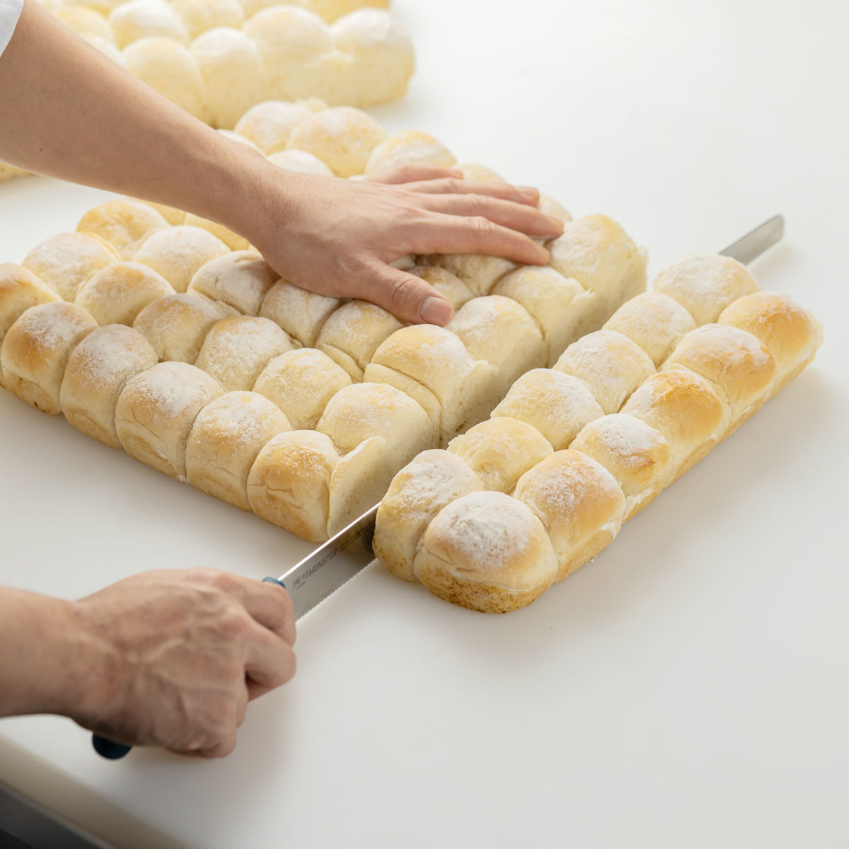大きなパンを少ない回数で綺麗に切り分けることができる、業界最長クラスの刃渡り45cmです。縦400×横600mmの業務用天板で焼いたケーキも、縦方向にナイフを一刀入れるだけで切り分けられ、作業効率がアップします。