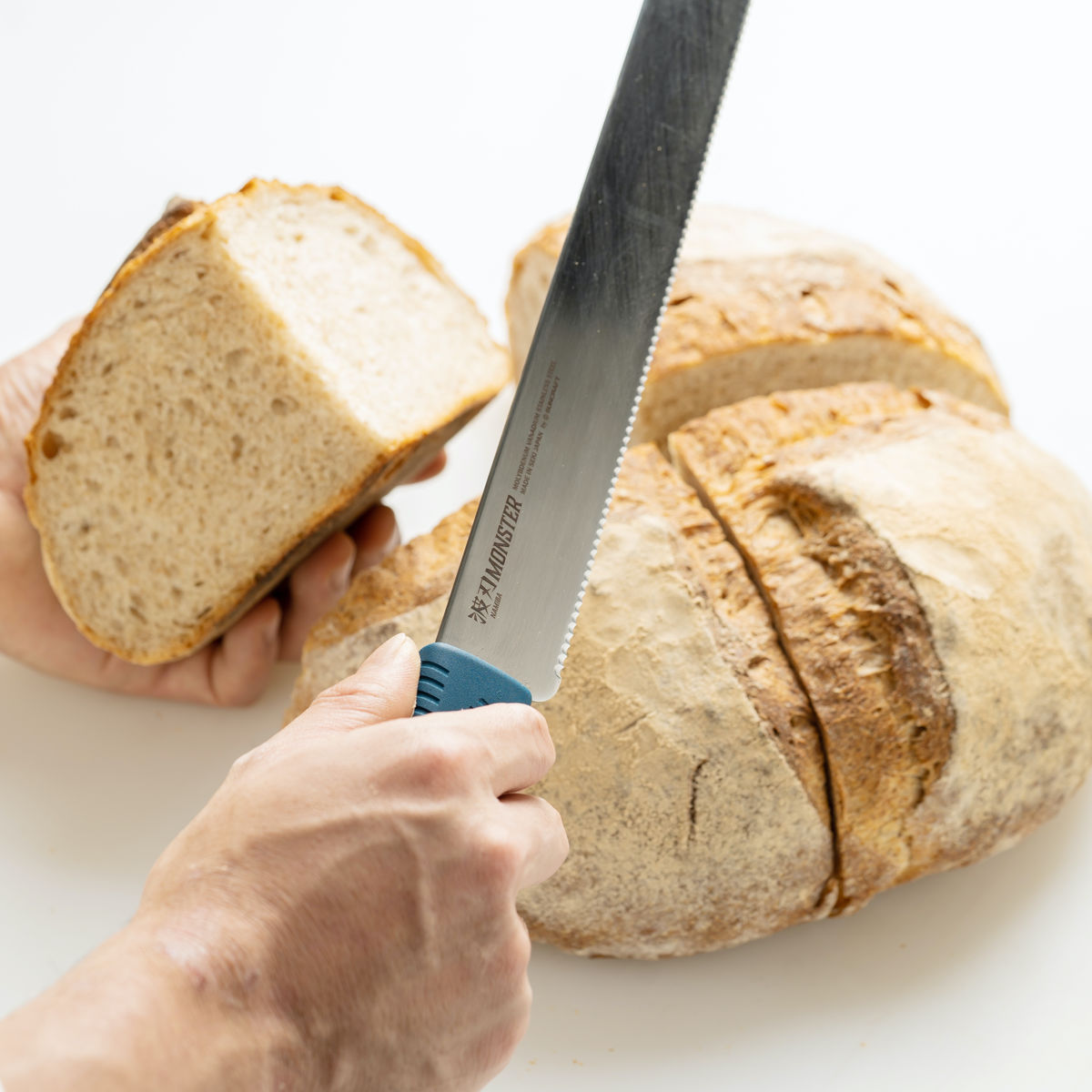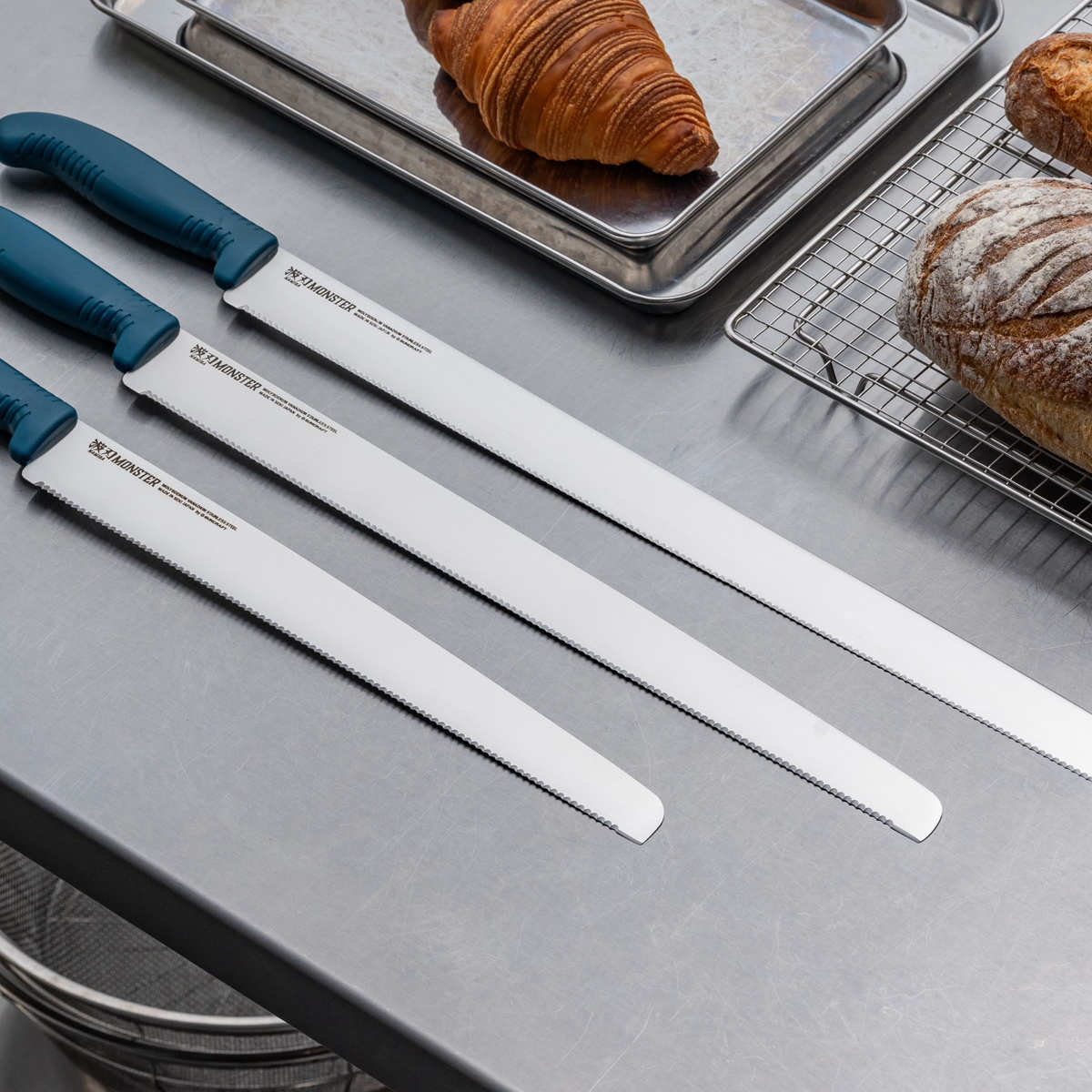 プロのパン職人やパティシエ向けに設計されたパン切り包丁シリーズ「波刃モンスター」です。切れ味の良い細かな波刃で、パンやケーキを美しく切り分けます。パティスリーでよく作られる4~6号ケーキの取り回しにちょうどいい長さです。
