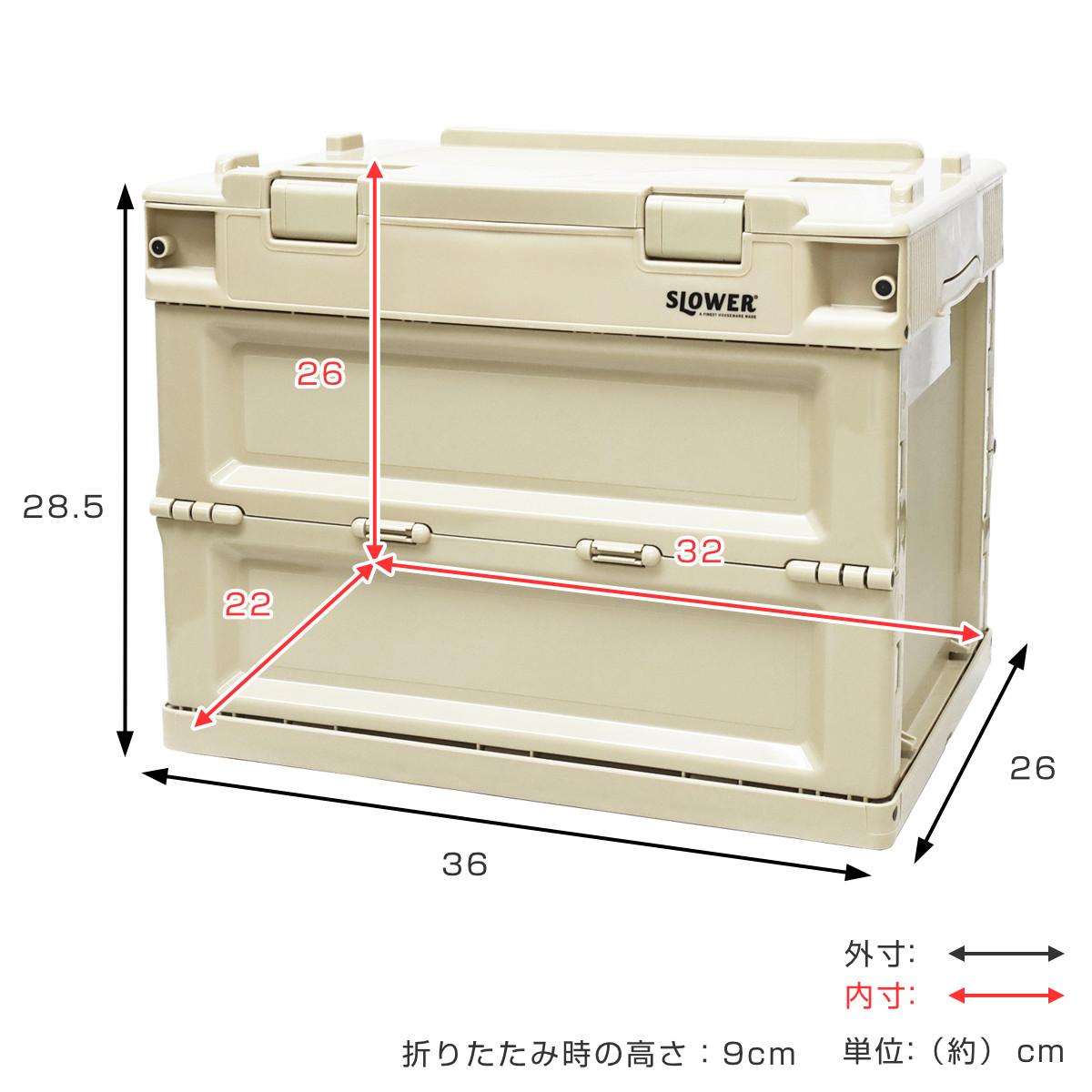 | サイズ | 外寸:約 幅36×奥行26×高さ28.5(cm) 内寸:約 幅32×奥行22×高さ26(cm) 折りたたみ時の高さ:9cm |