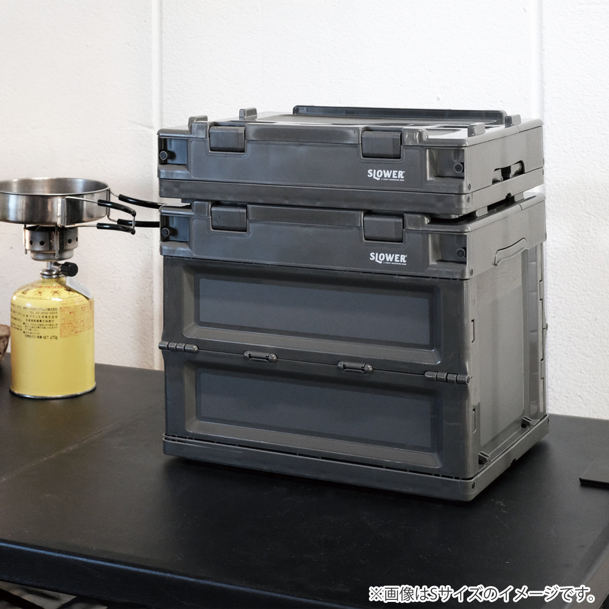 コンパクトサイズで小分け収納するのにちょうどいいSサイズのフォールディングコンテナです。インテリアではシェルフラックにも収まるサイズなので、手軽にアウトドアスタイルを演出できます。