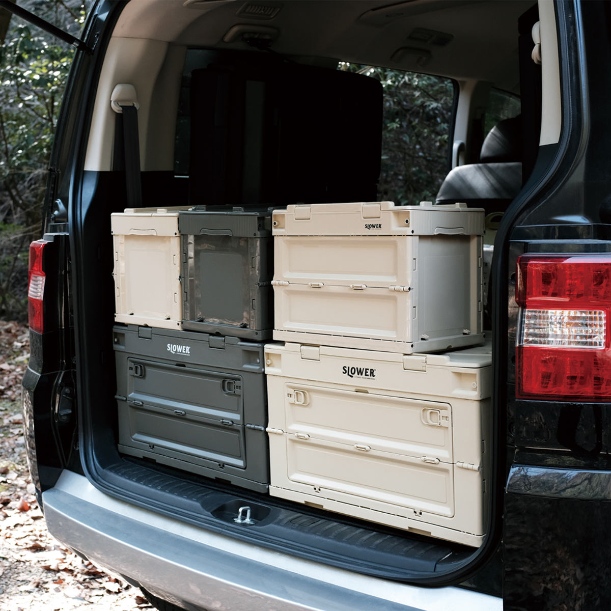 サイズ違いで積み重ね可能で、効率よく収納できるシンデレラフィット仕様。使わないときは平らに折りたため、省スペースで片付けられます。上部フタ部分にはスライド式のロック付きで安心です。