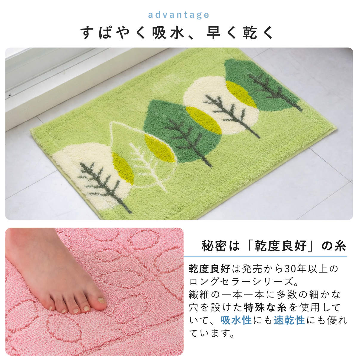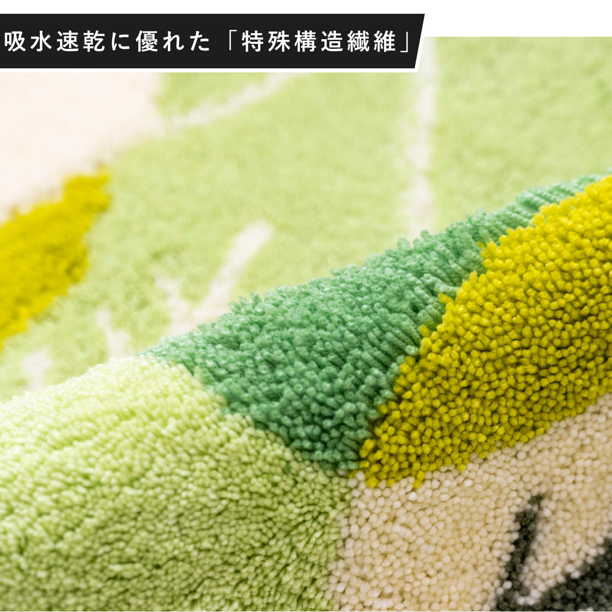 無数の細かな穴が設けられた「特殊構造繊維」を使用しています。この穴が水分を素早くたっぷり吸い取って直ちに拡散するため、マットの表面はいつもサラッと快適な使い心地が続きます。