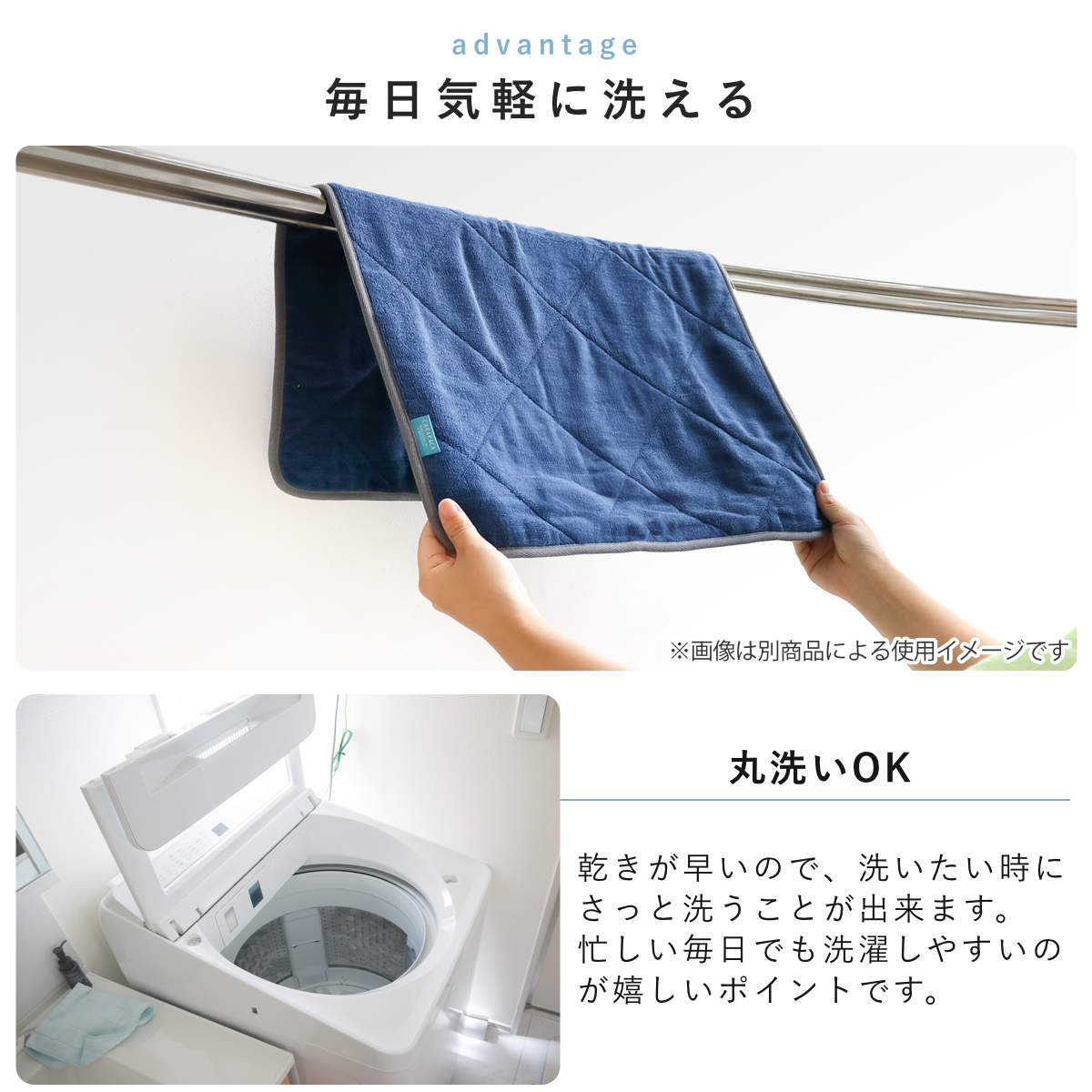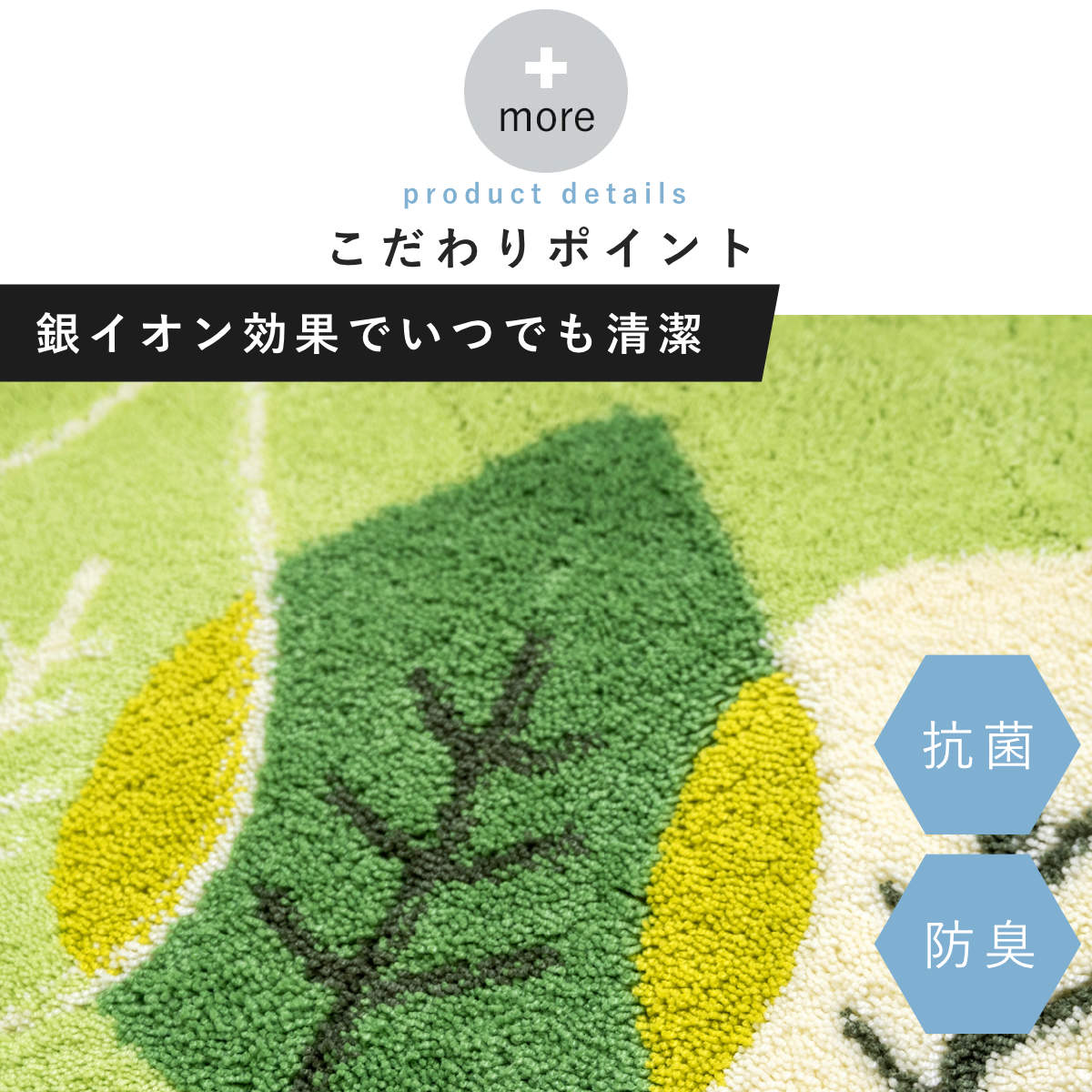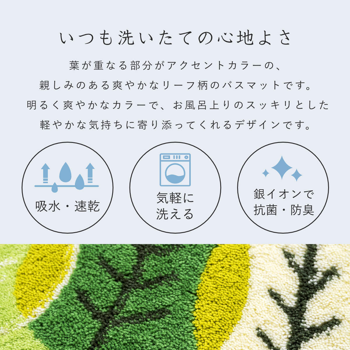洗っても効果が続く抗菌防臭加工付きで、マット上の菌の増殖を抑制するので、いつまでも衛生的にお使いいただけます。