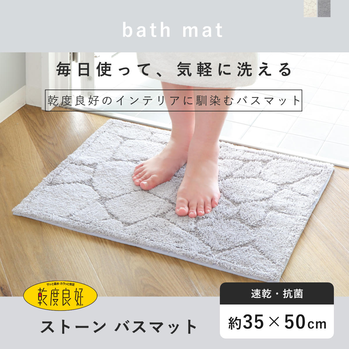 バスマット 乾度良好 ストーン 35×50cm 速乾 ( 風呂 マット 速乾性 吸水 吸水性 抗菌 防臭 滑り止め お風呂 浴室 長方形 吸水速乾 バス バス用品 お風呂用品 バスグッズ 洗える 丸洗い 足ふき 50cm ) 【グレー】