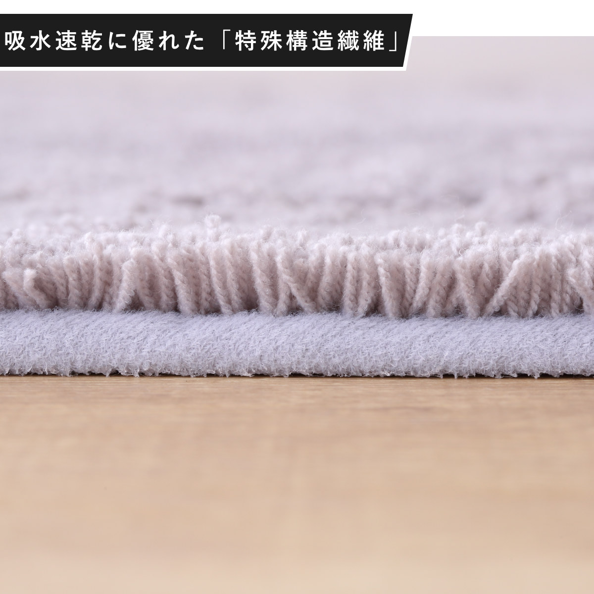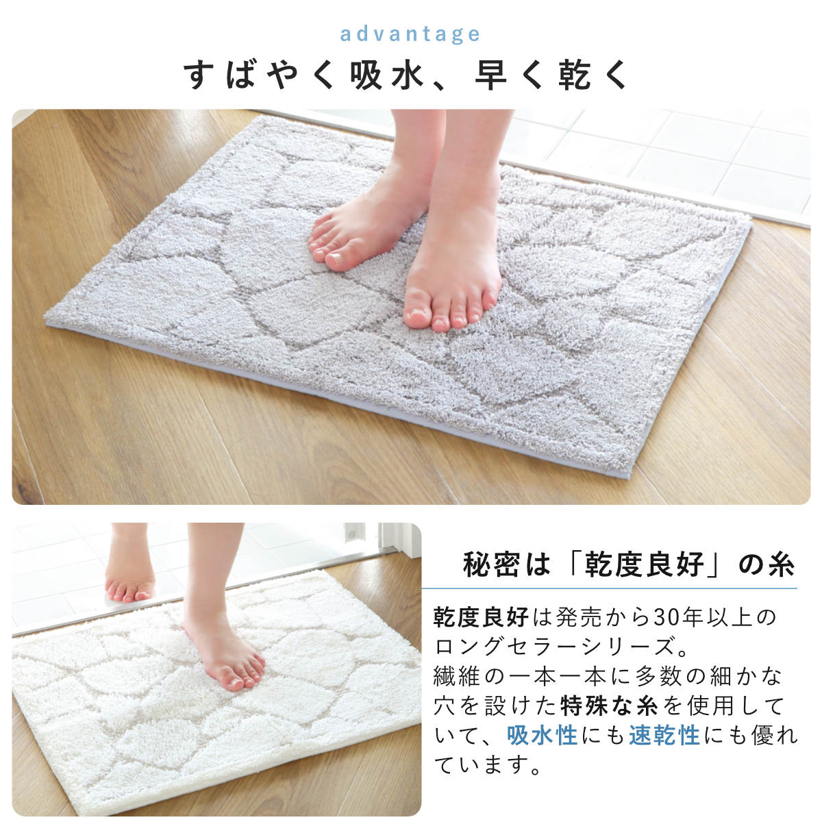 無数の細かな穴が設けられた「特殊構造繊維」を使用しています。この穴が水分を素早くたっぷり吸い取って直ちに拡散するため、マットの表面はいつもサラッと快適な使い心地が続きます。