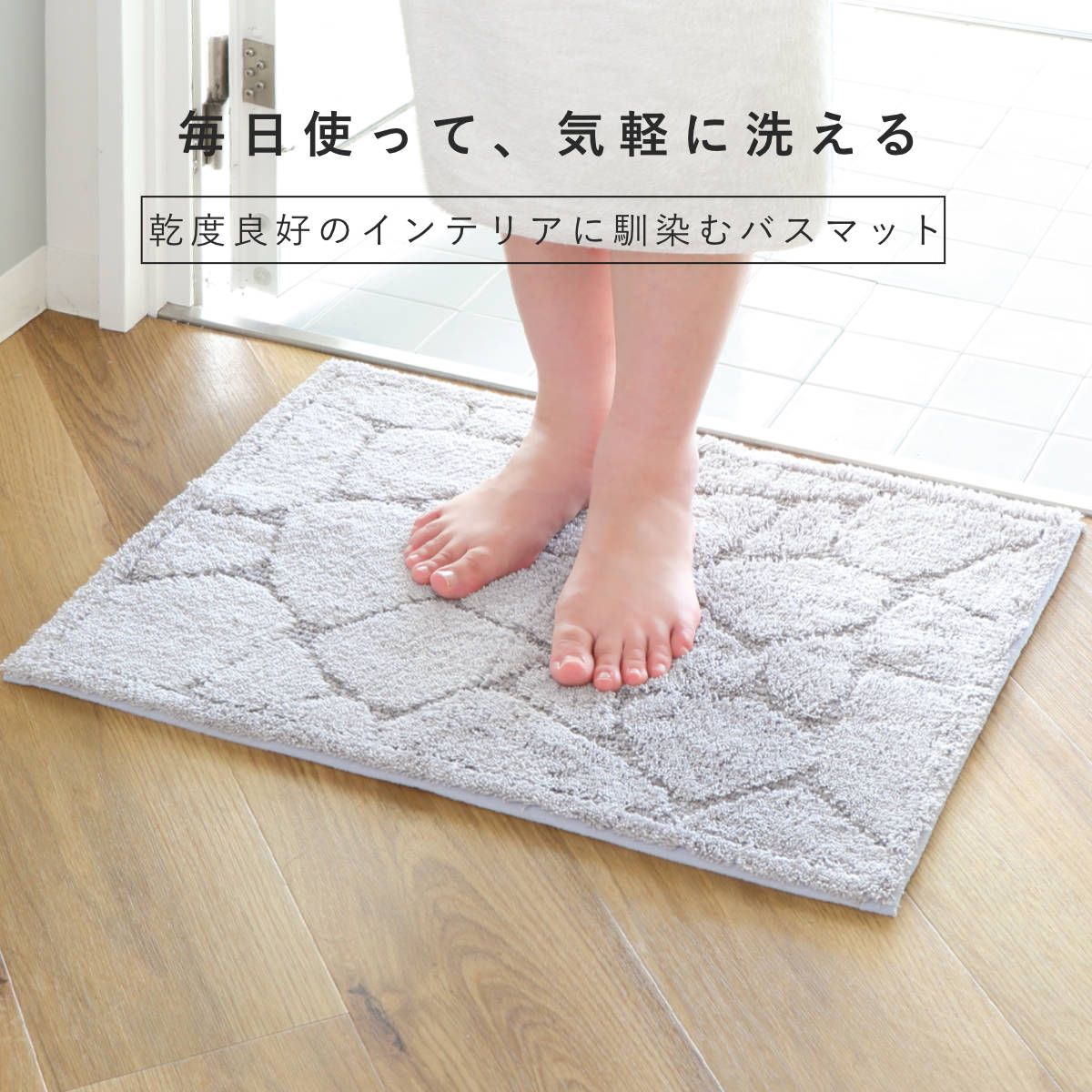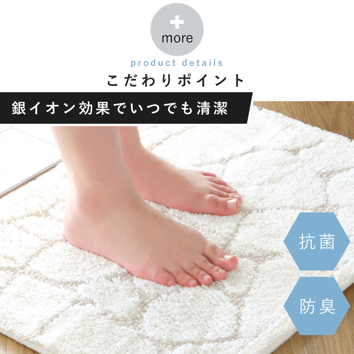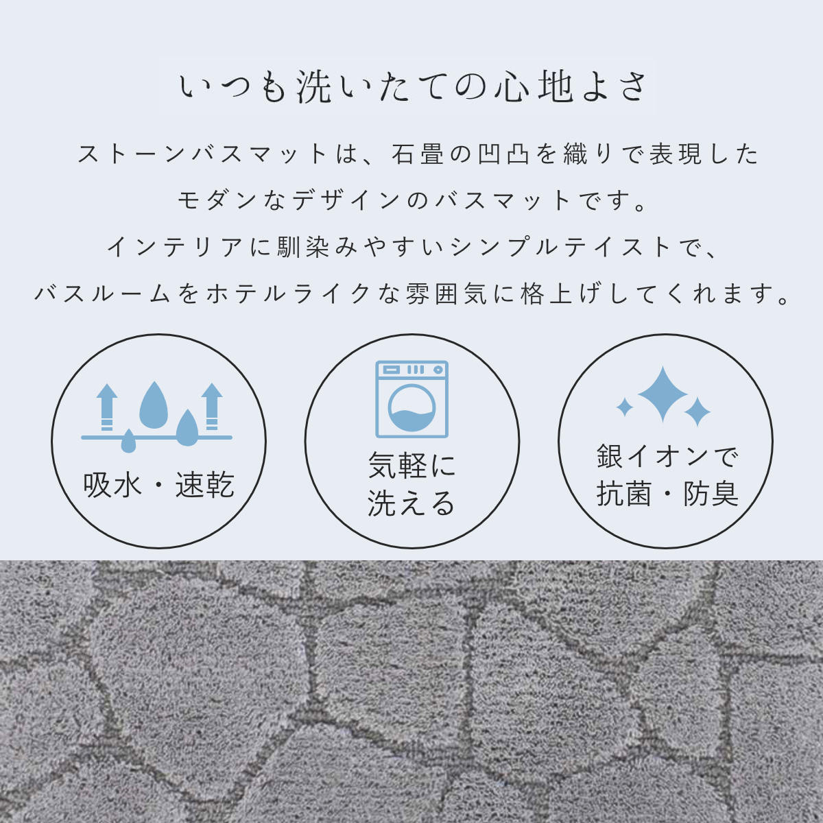 洗っても効果が続く抗菌防臭加工付きで、マット上の菌の増殖を抑制するので、いつまでも衛生的にお使いいただけます。