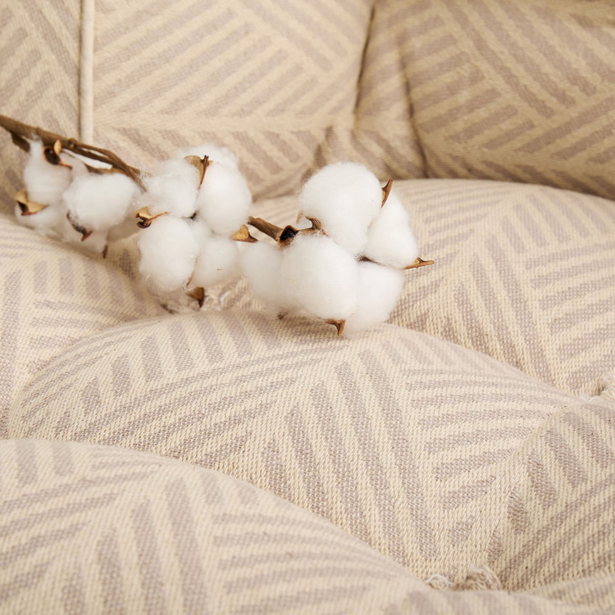 張地には、インド綿100%の生地を使用。さらっとしたやさしい肌ざわりで、季節を問わず心地よくお使いいただけます。素肌に触れてもやさしく、お子様のいるご家庭でも安心して取り入れられる素材です。