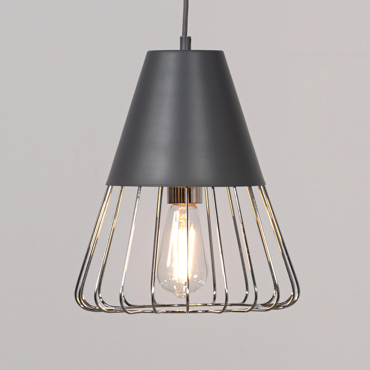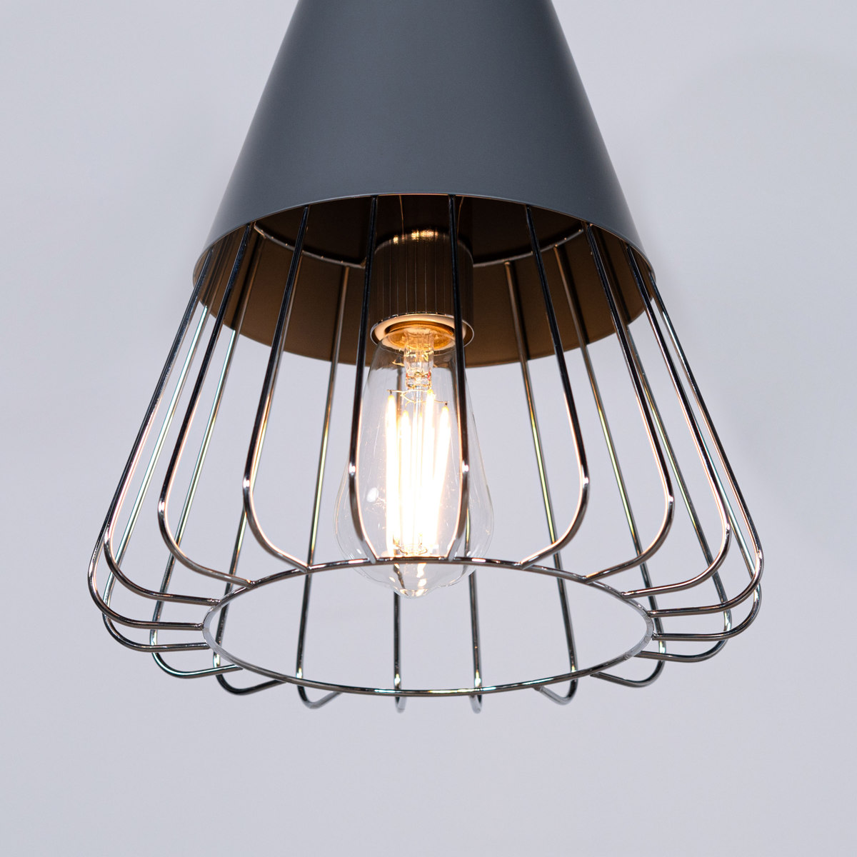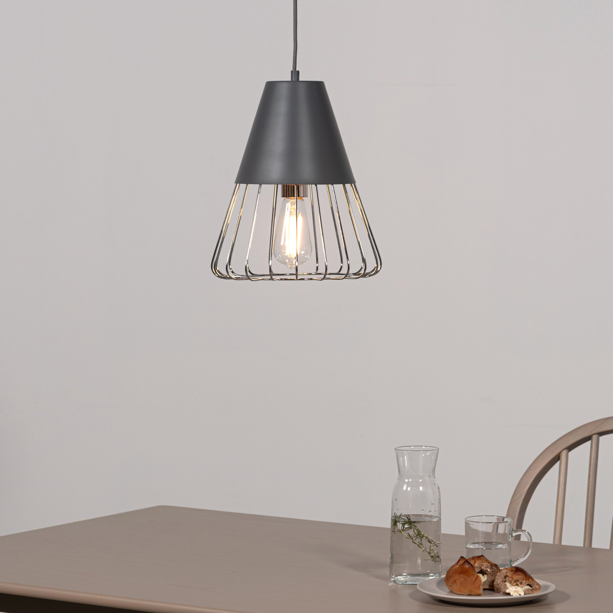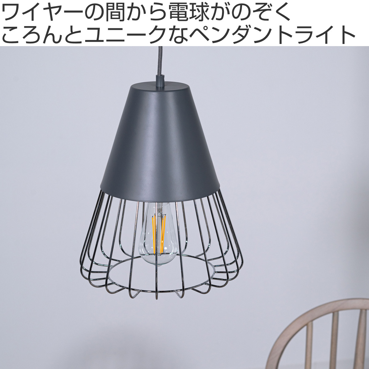 マットな質感のスチールとワイヤーフレームの組み合わせがスタイリッシュなペンダントライトです。シェード下部がワイヤーになっているので電球が露出し、どこか懐かしい雰囲気を演出します。点灯時に美しいのはもちろん、消灯時もインテリアとして存在感を放ちます。