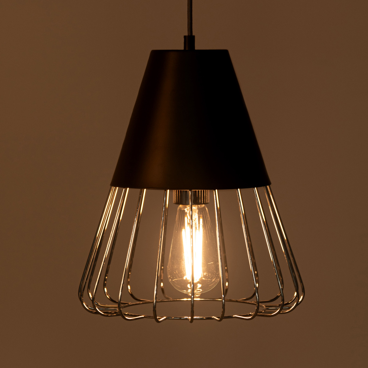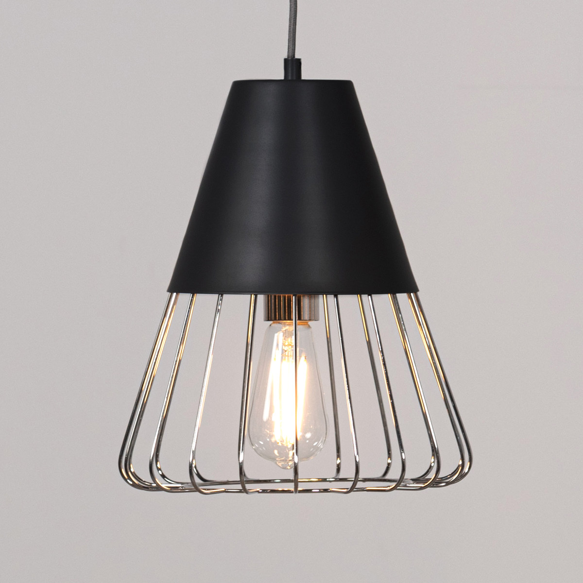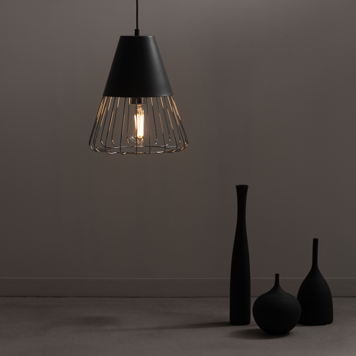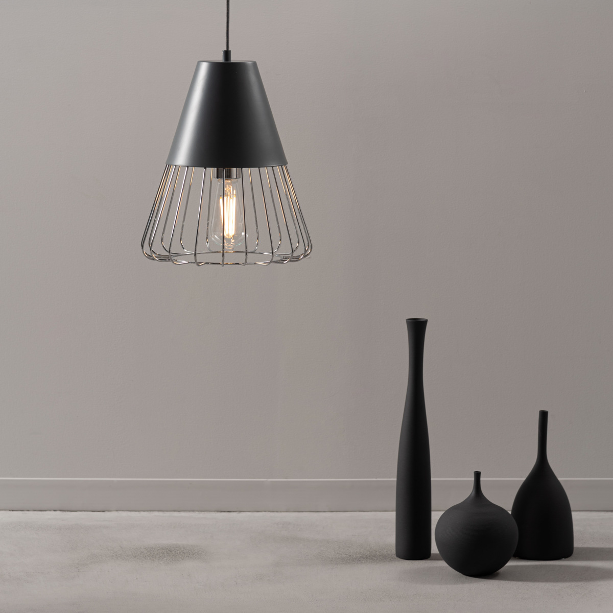 マットな質感のスチールとワイヤーフレームの組み合わせがスタイリッシュなペンダントライトです。シェード下部がワイヤーになっているので電球が露出し、どこか懐かしい雰囲気を演出します。点灯時に美しいのはもちろん、消灯時もインテリアとして存在感を放ちます。