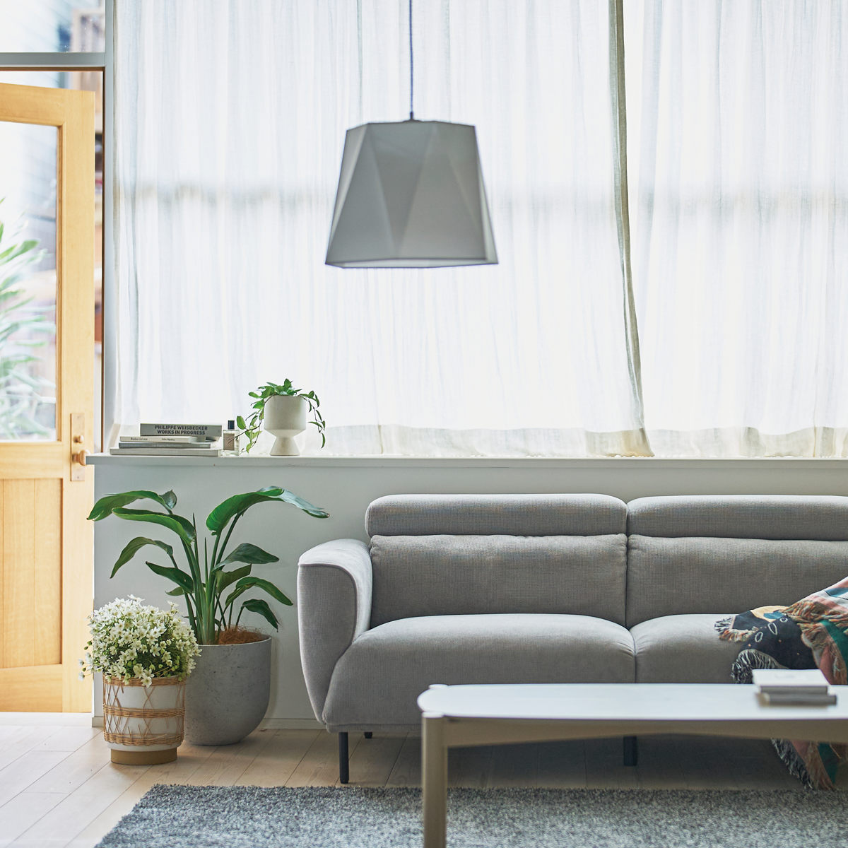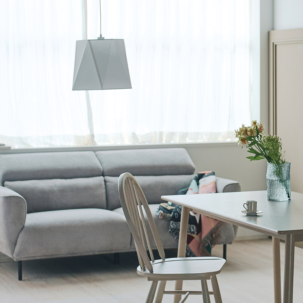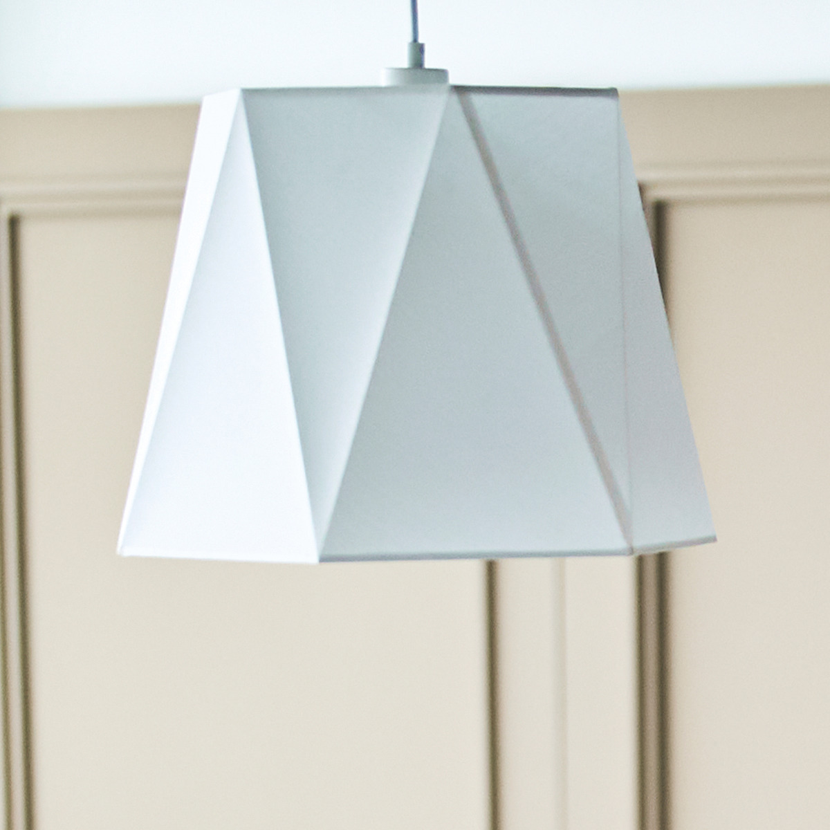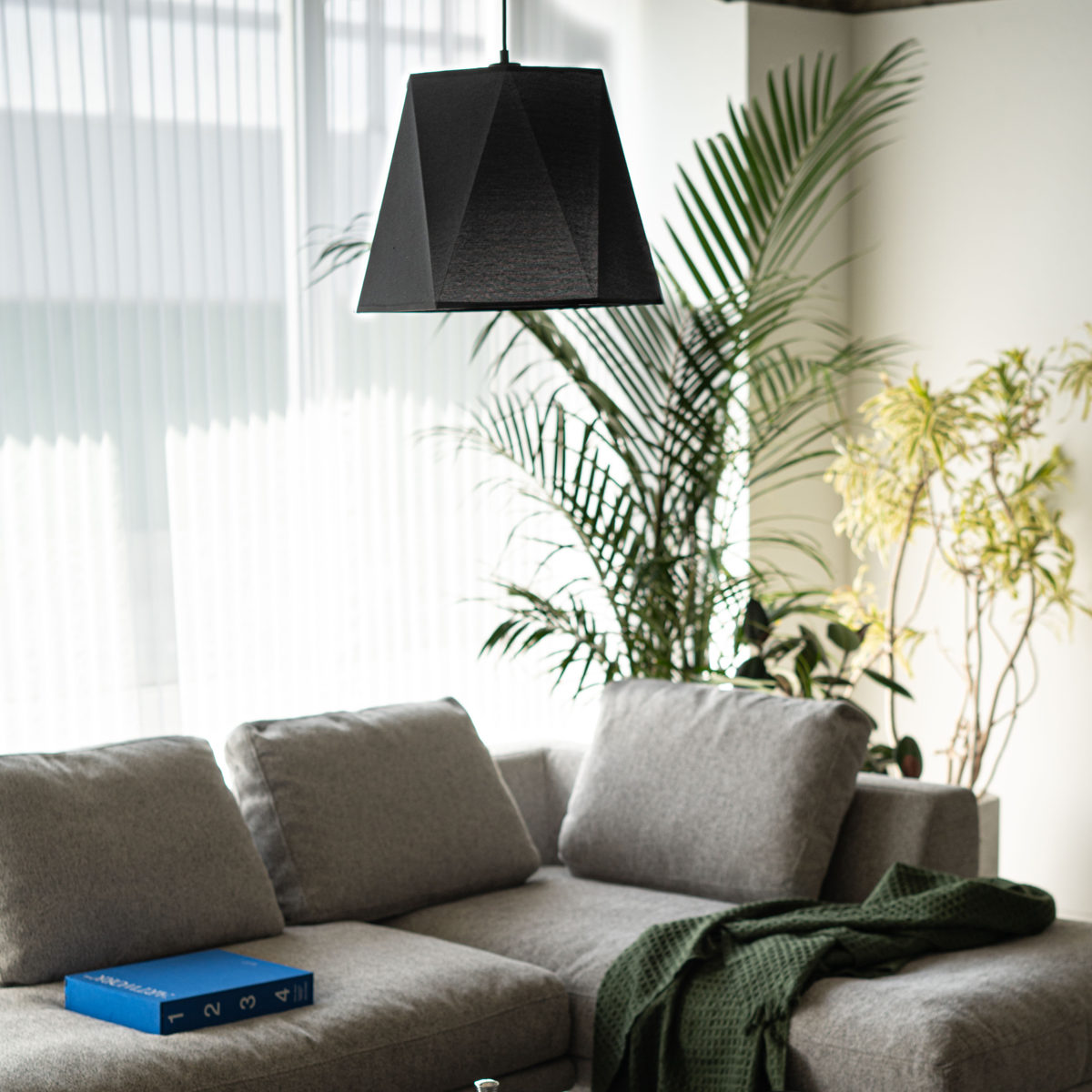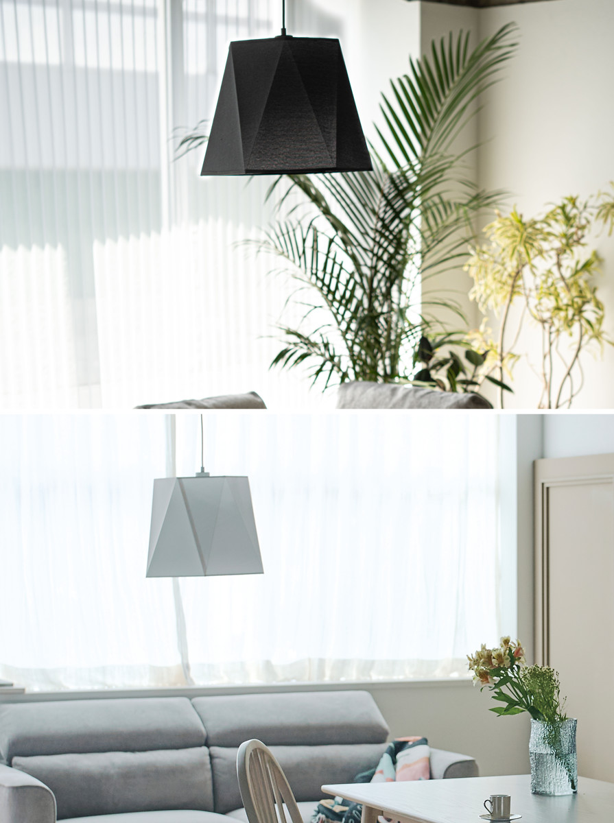 角ばったカタチのシェードが特徴的なペンダントライトです。直線的でスタイリッシュなフォルムとファブリックのあたたかみがマッチし、洗練された空間を作り出します。