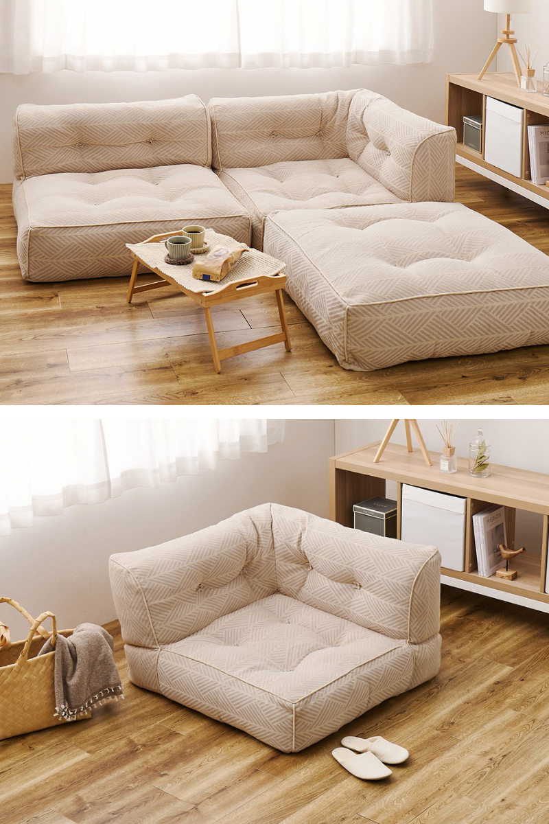 シリーズ商品を組み合わせればレイアウトも自由自在。一人掛けからロングソファ、カウチソファなど好きな組み合わせでローソファを作ることができます。ライフスタイルに合わせてゆったりとくつろげる癒しの空間を演出します。