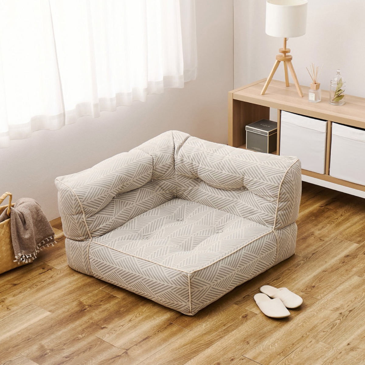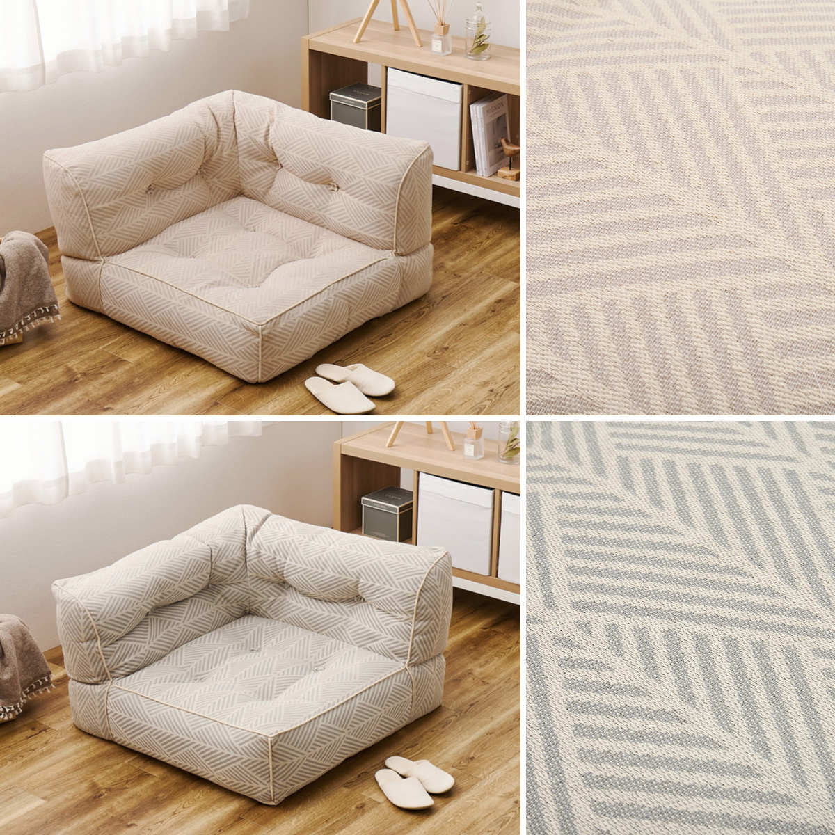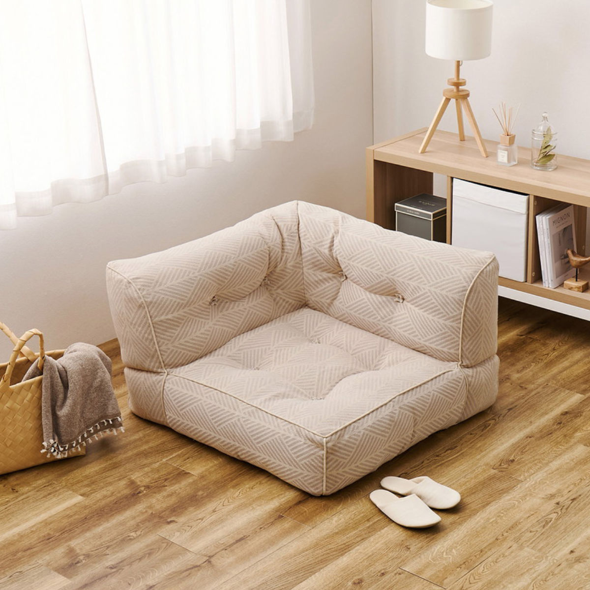やさしい色合いのヘリンボーン調コットン素材と、思わずころんと寝転びたくなる包み込まれるようなフォルムが、空間にふんわりとした温もりと可愛らしさを演出します。北欧テイストやナチュラルインテリアとの相性もよく、置くだけでお部屋がやわらかな印象に。