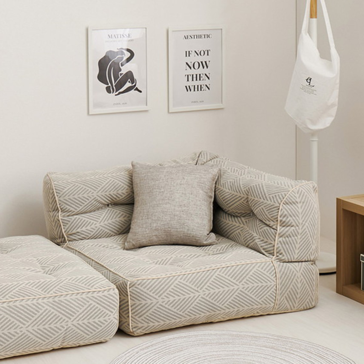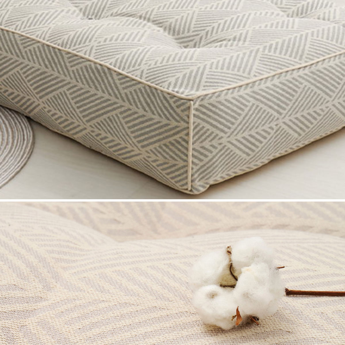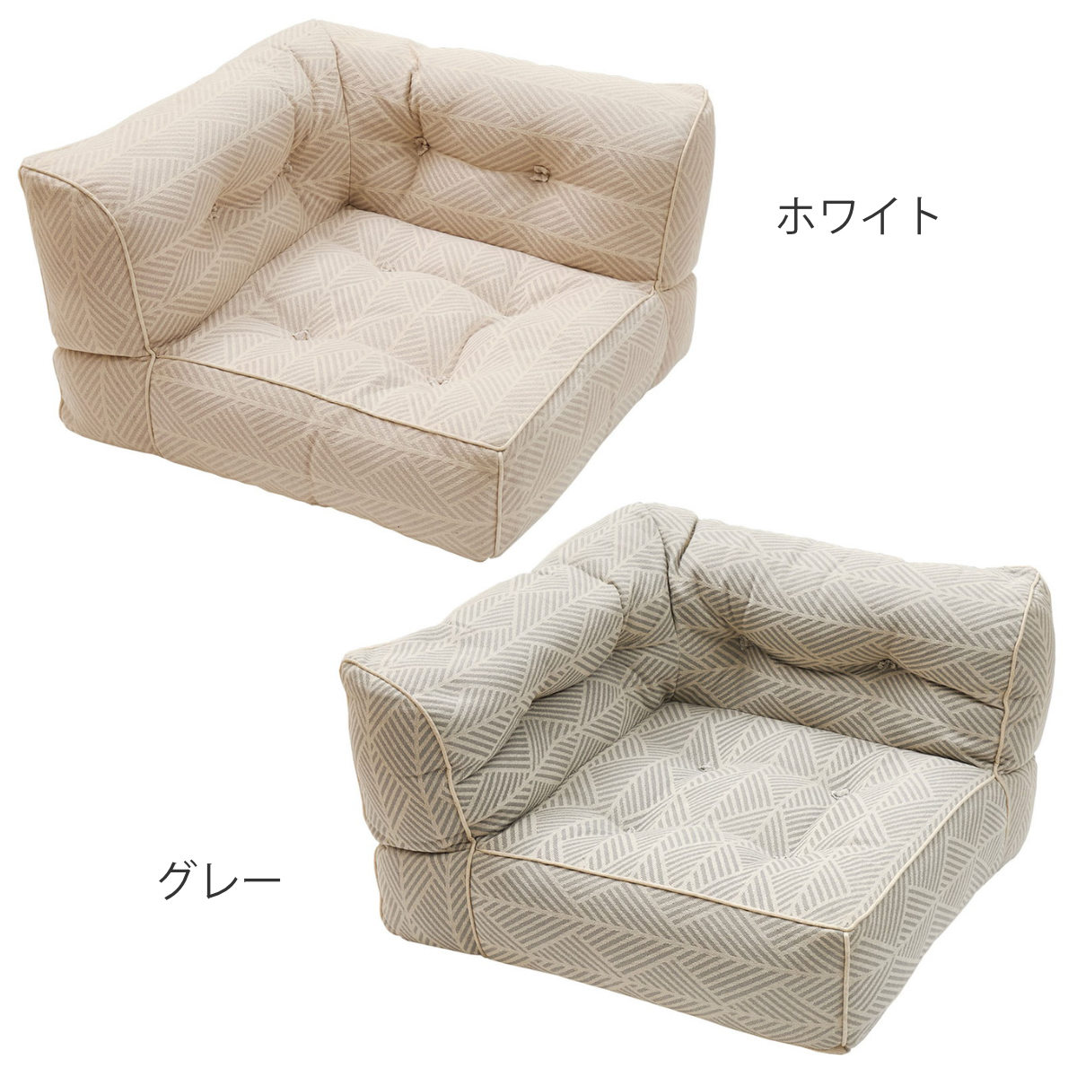 やさしい色合いのヘリンボーン調コットン素材と、思わずころんと寝転びたくなる包み込まれるようなフォルムが、空間にふんわりとした温もりと可愛らしさを演出します。北欧テイストやナチュラルインテリアとの相性もよく、置くだけでお部屋がやわらかな印象に。