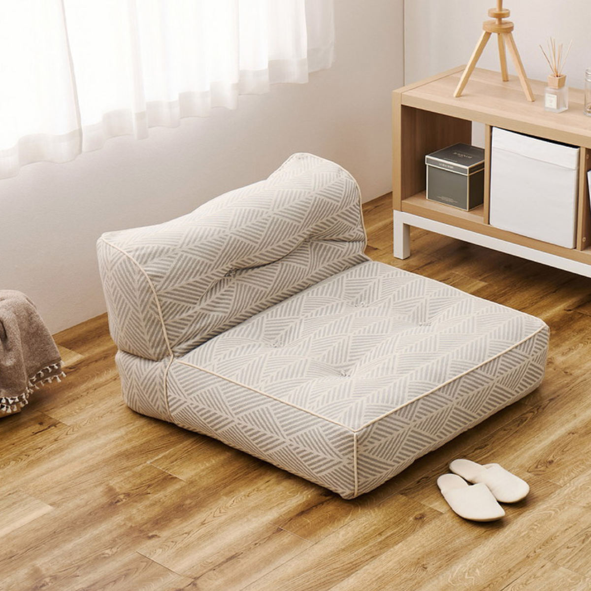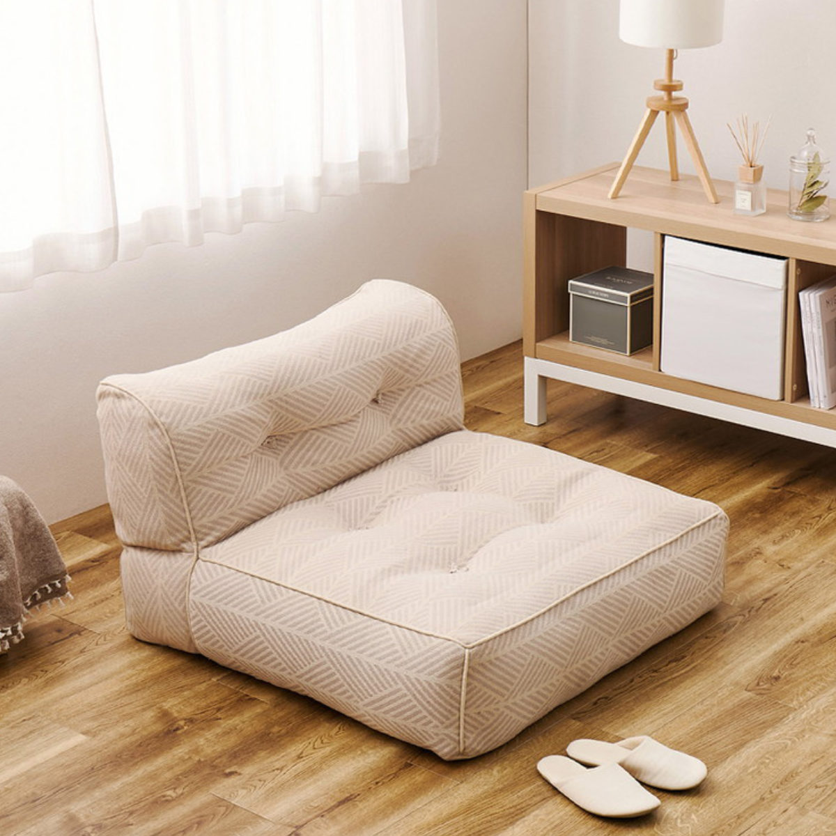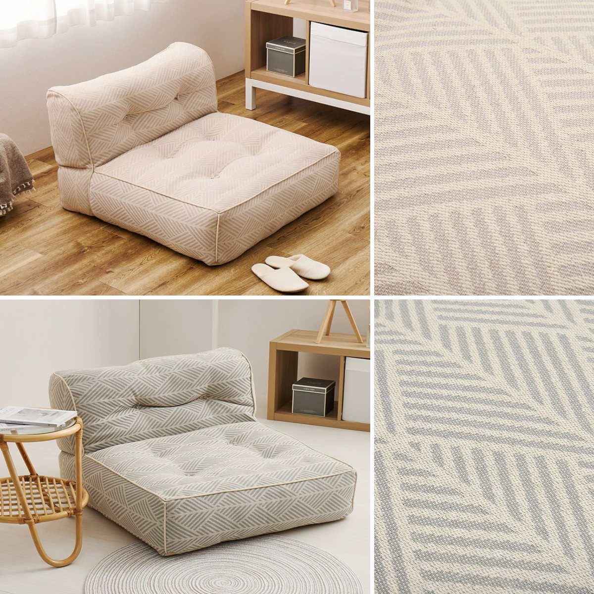 やさしい色合いのヘリンボーン調コットン素材と、思わずころんと寝転びたくなる包み込まれるようなフォルムが、空間にふんわりとした温もりと可愛らしさを演出します。北欧テイストやナチュラルインテリアとの相性もよく、置くだけでお部屋がやわらかな印象に。