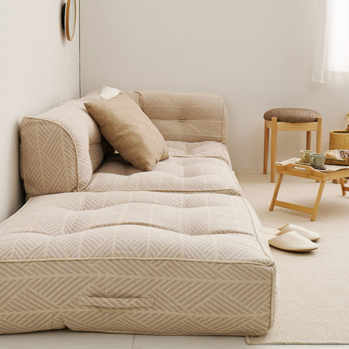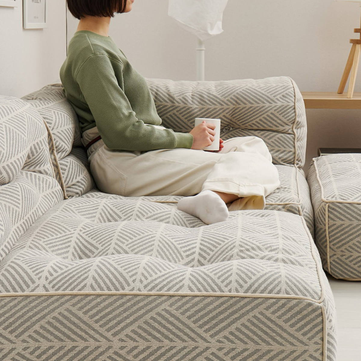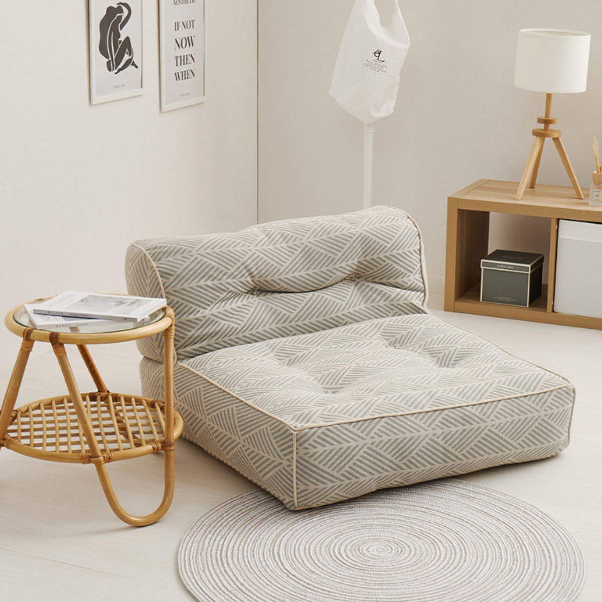 やさしい色合いのヘリンボーン調コットン素材と、思わずころんと寝転びたくなる包み込まれるようなフォルムが、空間にふんわりとした温もりと可愛らしさを演出します。北欧テイストやナチュラルインテリアとの相性もよく、置くだけでお部屋がやわらかな印象に。