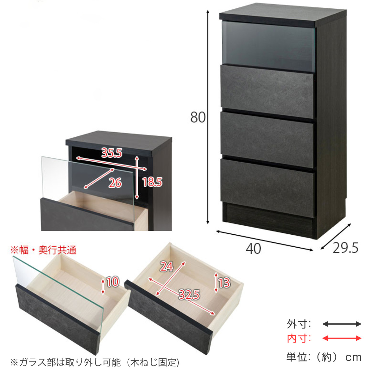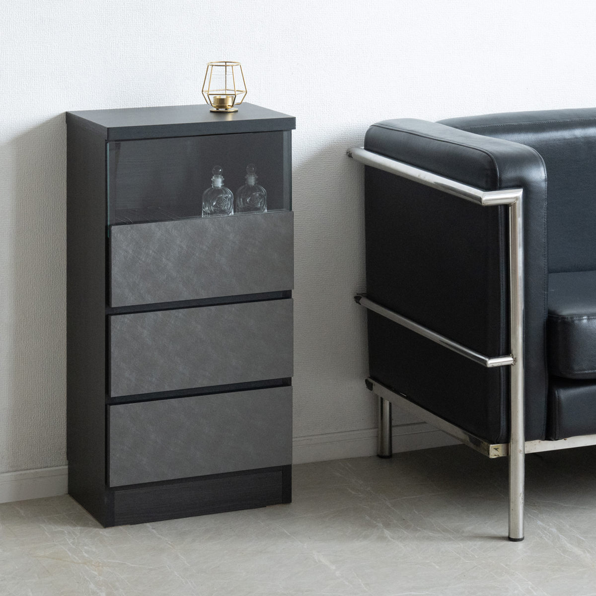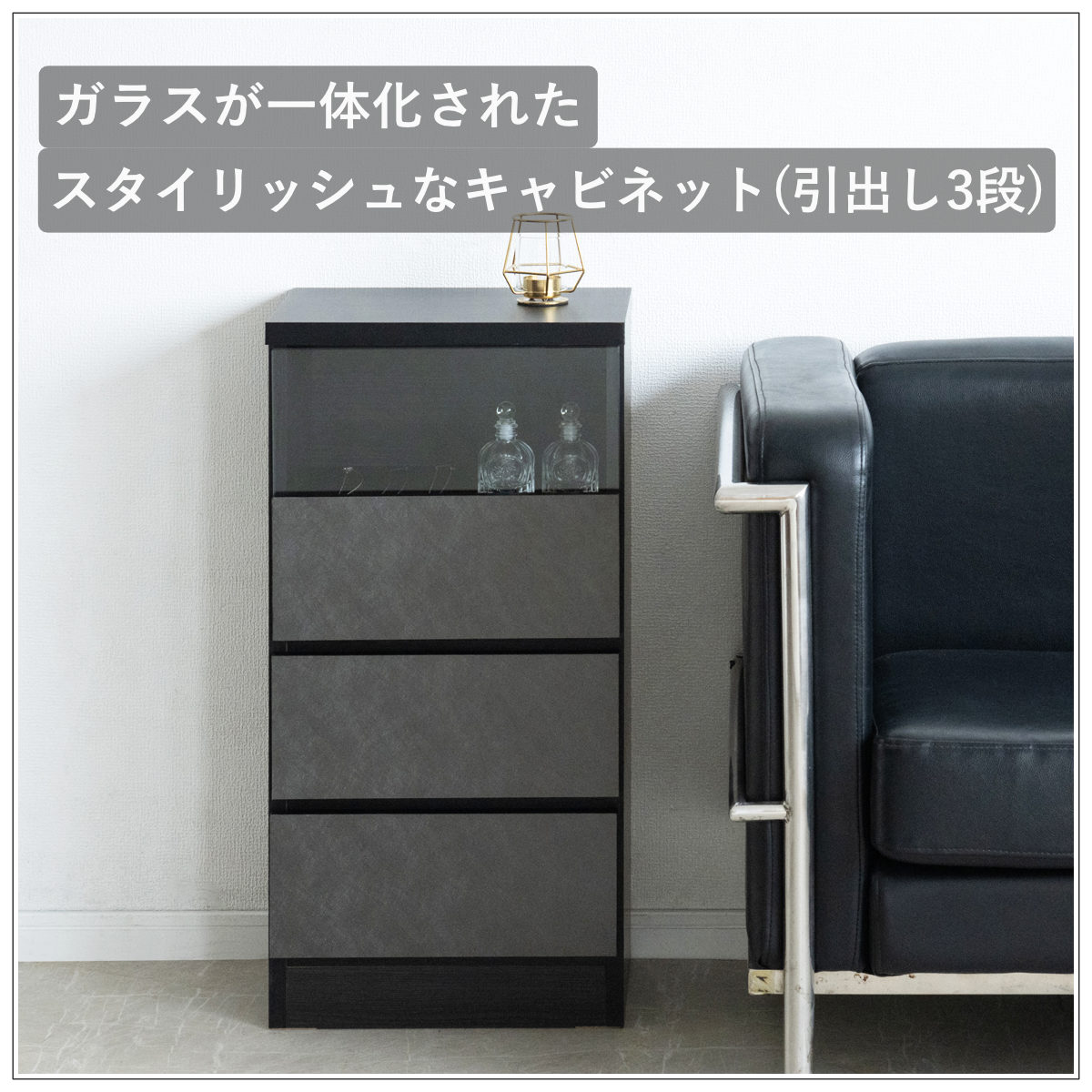 キャビネット 幅40cm 引き出し3段 日本製 完成品 ガラス窓 ( 棚 ラック メタリック 引出し カウンター下 3段 ディスプレイ 窓下 組み合わせ 収納 家具 薄型 奥行スリム マットブラック グレー )