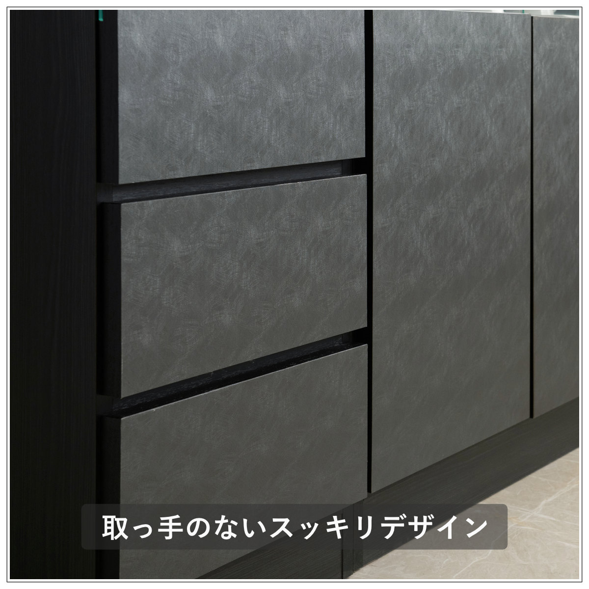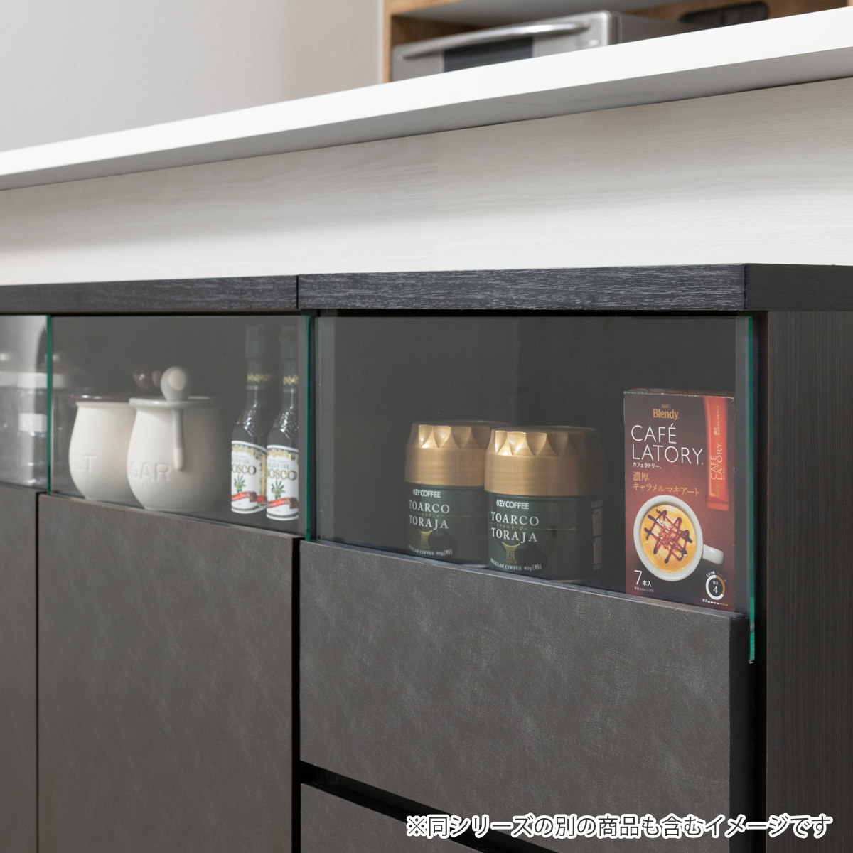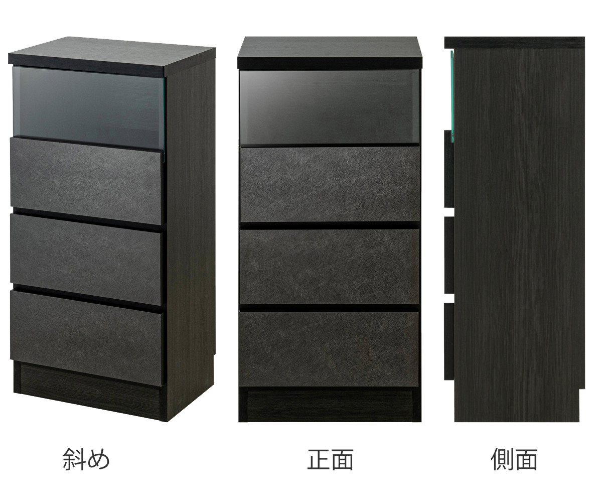 キャビネット 幅40cm 引き出し3段 日本製 完成品 ガラス窓 ( 棚 ラック メタリック 引出し カウンター下 3段 ディスプレイ 窓下 組み合わせ 収納 家具 薄型 奥行スリム マットブラック グレー )