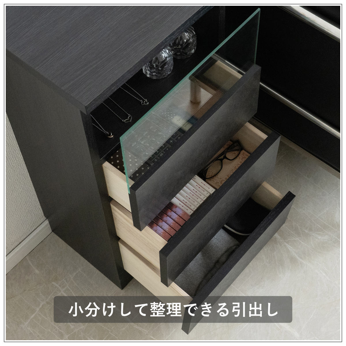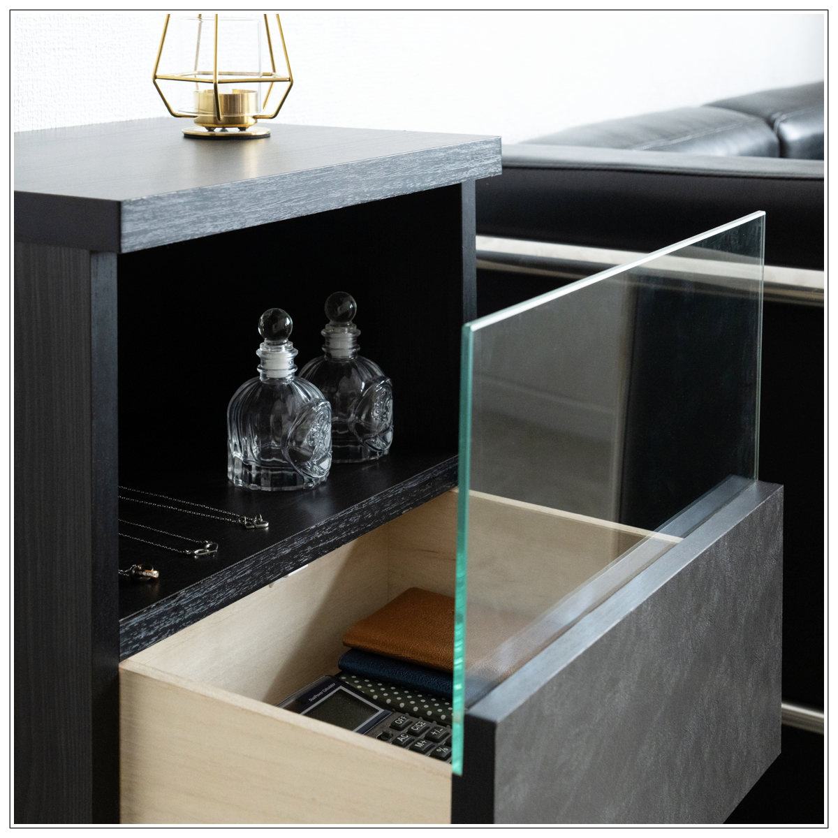 引き出し上部に一体化したガラスが、スタイリッシュな印象を与えつつ、「魅せる収納」 としても活躍します。クリアガラスがメタリックの艶感と調和し、コレクションボードとして飾るアイテムをより美しく魅せてくれます。ソファサイドに置いても、程よい存在感でお部屋の動線を妨げないサイズです。