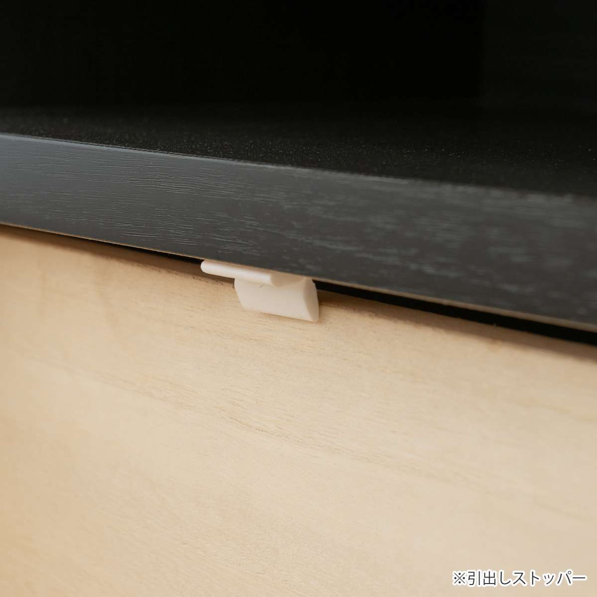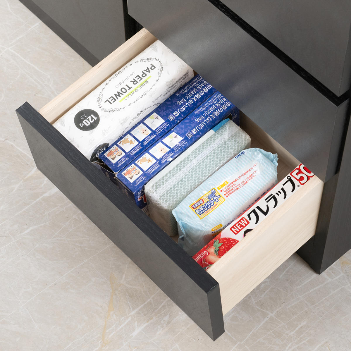 3杯の引出しがあるので、リビングでは普段使いの散らかりがちな小物を、カウンター下ではキッチン用品のストックなどを収納することができます。落下防止のストッパーも付いているので安心です。