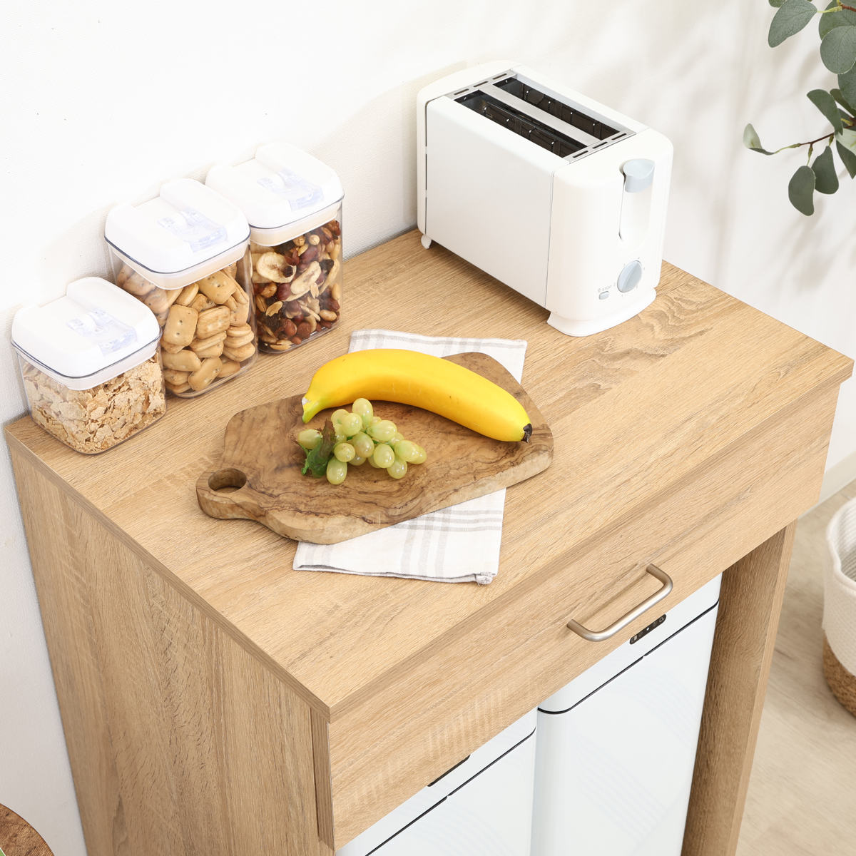 デッドスペースになりがちな、ごみ箱上の空間にラックを置くことで、収納スペースとして有効活用できるラックです。ゴミ箱をスッキリ収納でき、天板は作業台として使ったりトースターなどの家電を置いたりできます。