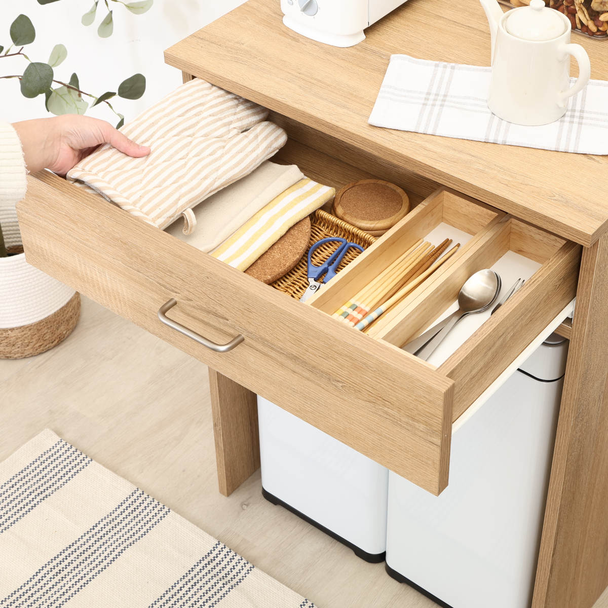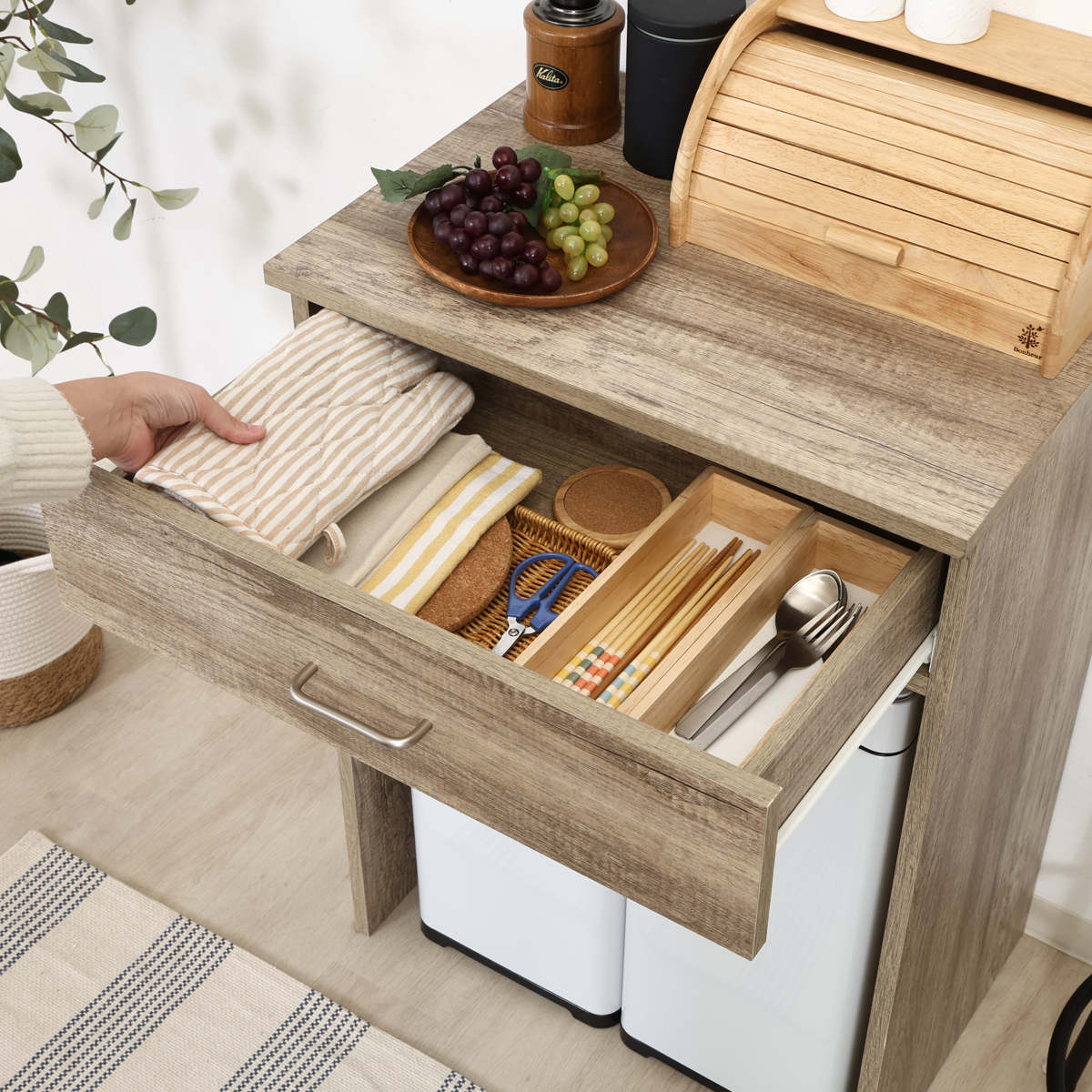 引出しにはカトラリーやゴミ袋など、キッチン回りの小物を収納できます。生活感を隠しながら、キッチンまわりをすっきり整えられます。