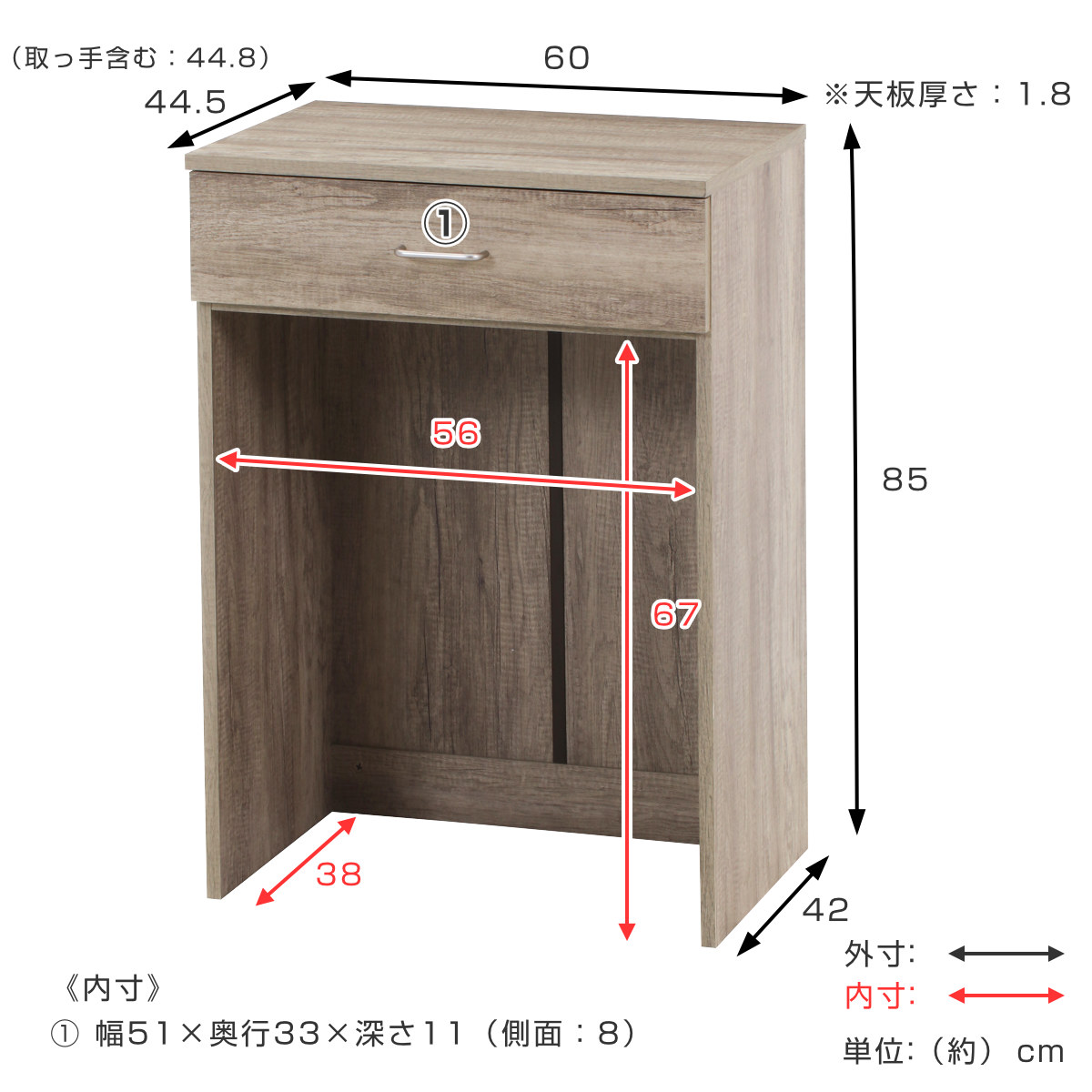 | 材質 | 本体:プリント紙化粧繊維板 取手:金属(鋼) |