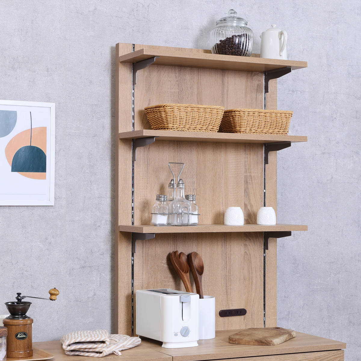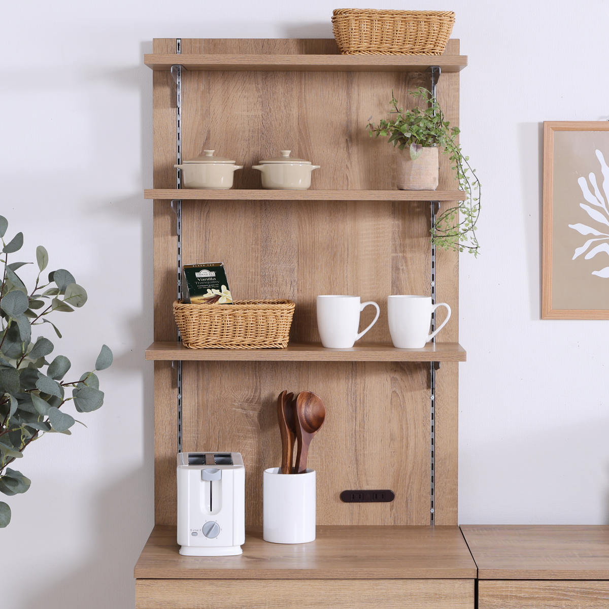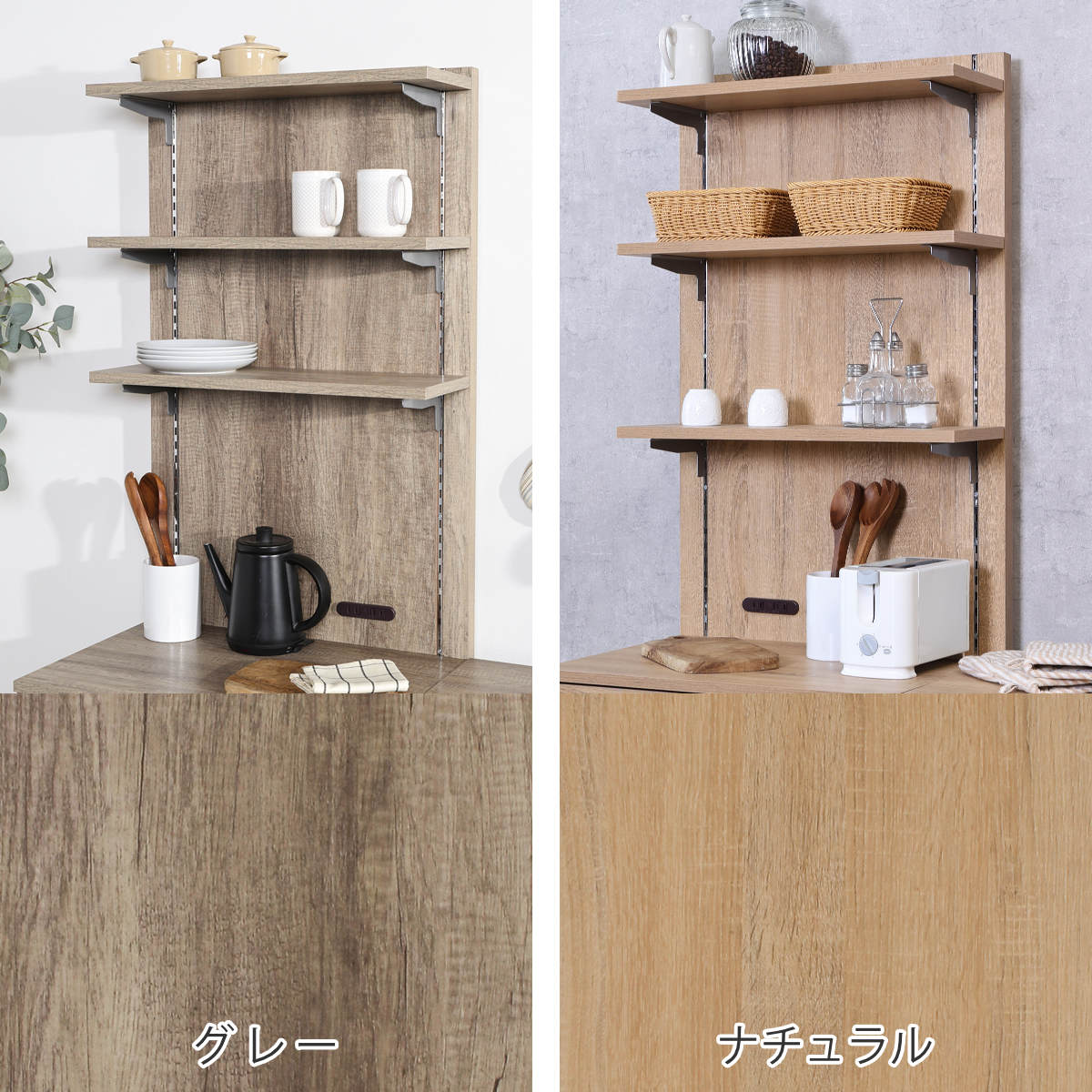 別売りのキッチンボードに取り付けて、収納スペースを手軽に拡張できるバックボードです。上に収納を拡げられ、食器や調味料をたっぷり収納できる3段です。