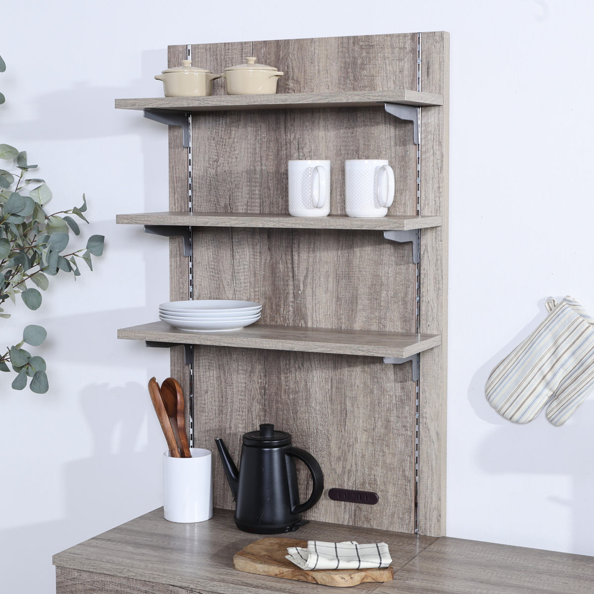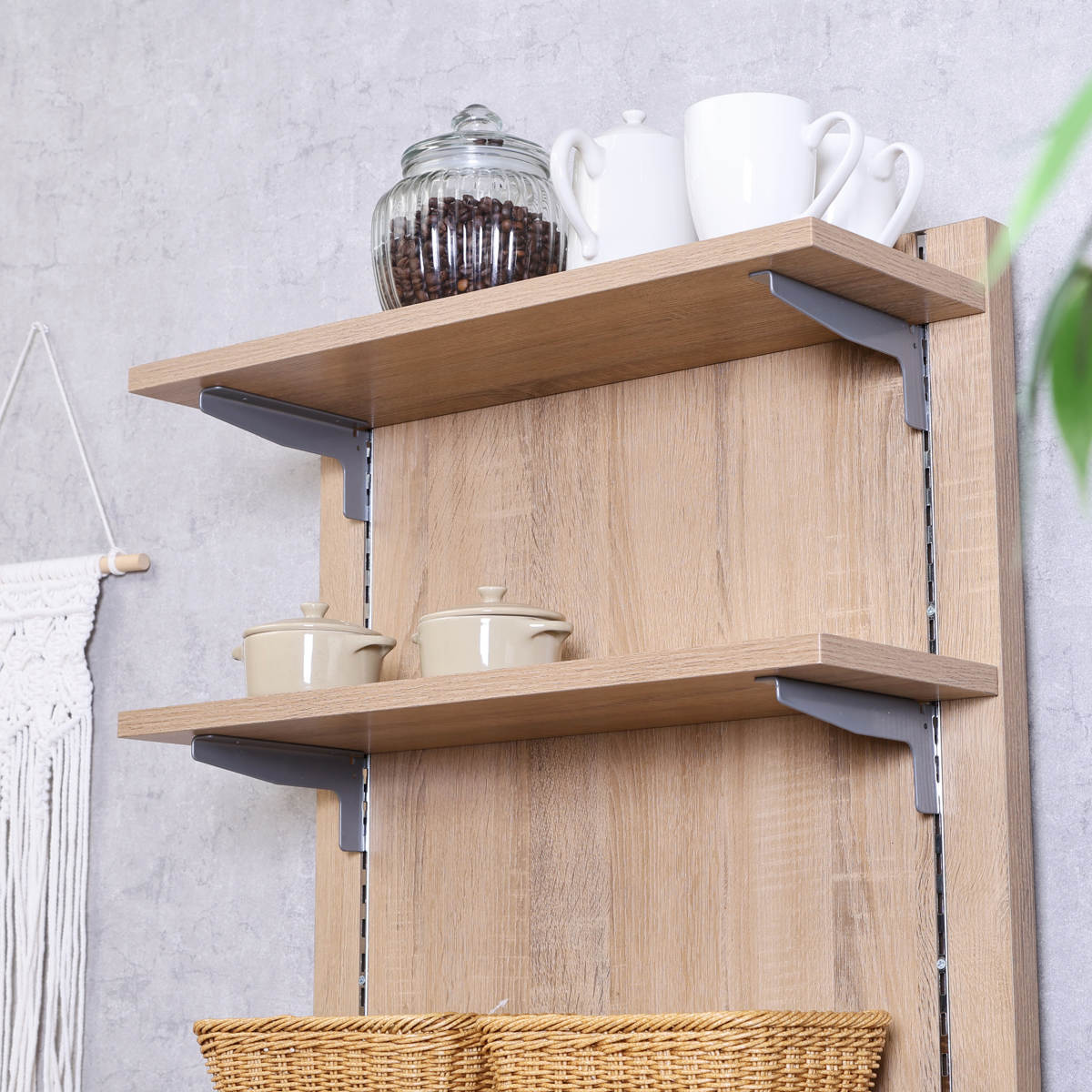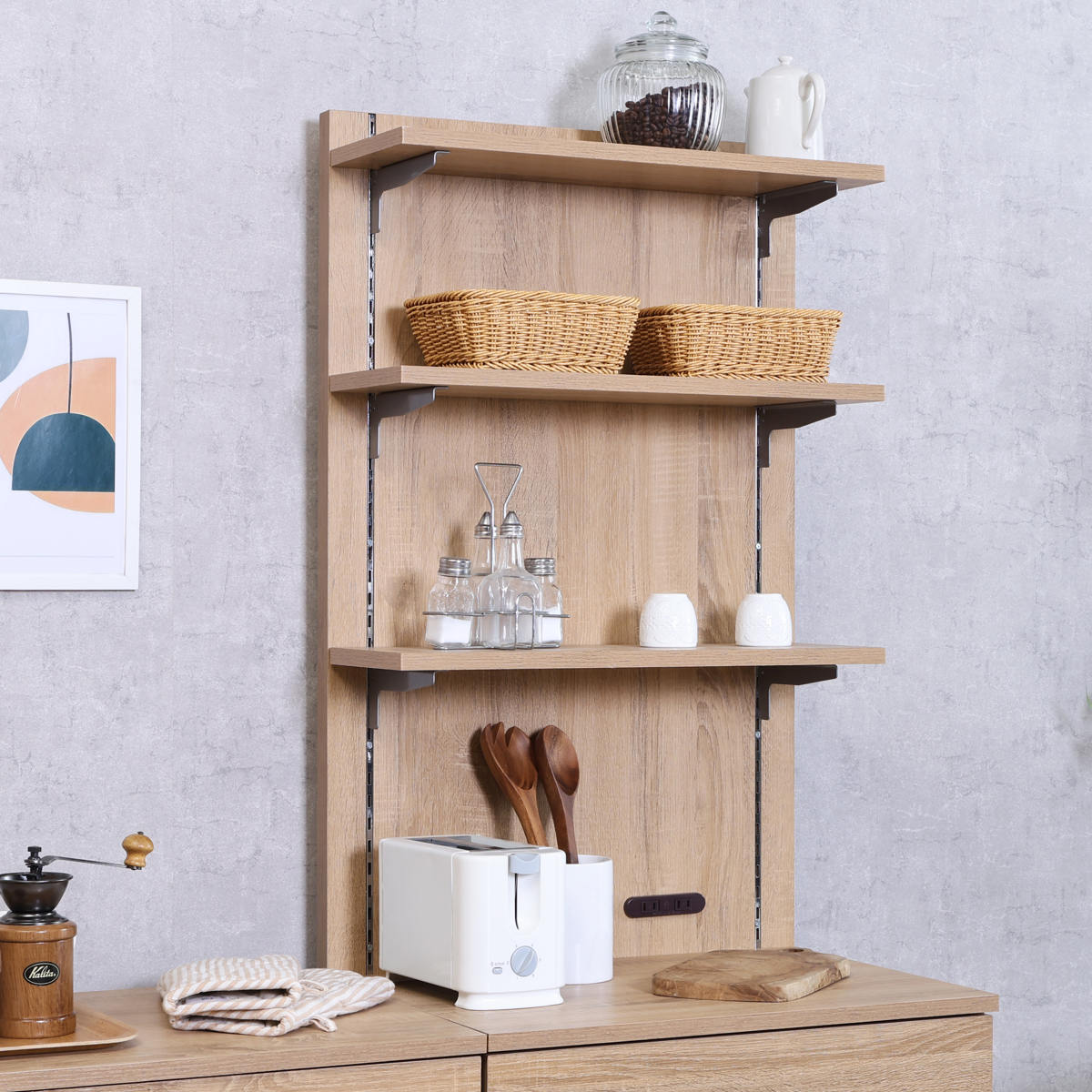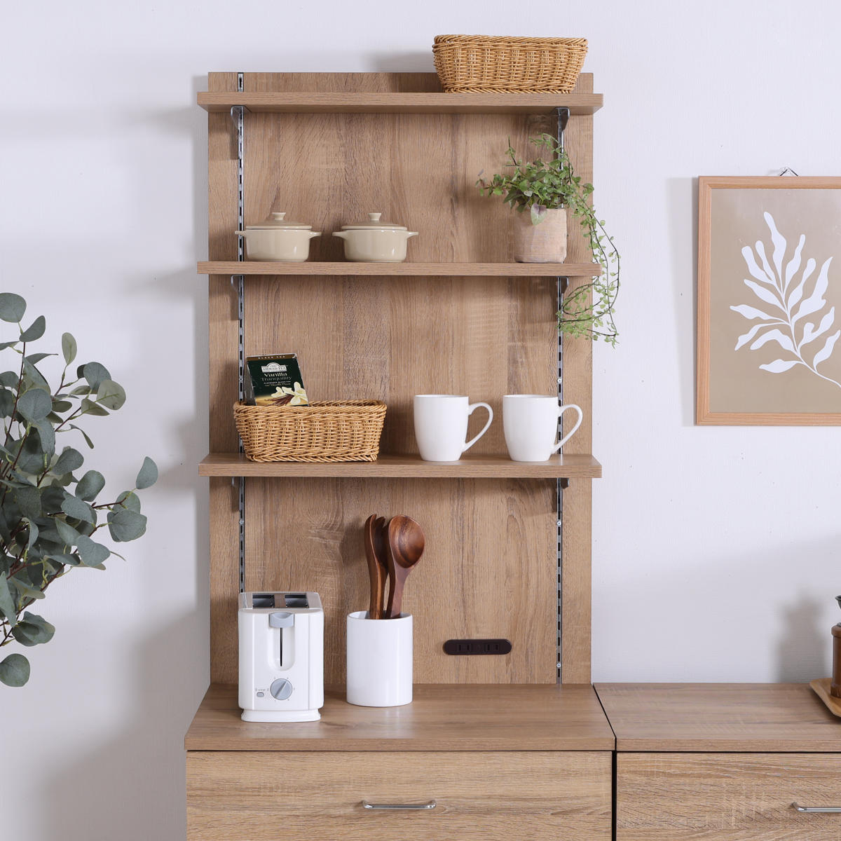 別売りのキッチンボードに取り付けて、収納スペースを手軽に拡張できるバックボードです。上に収納を拡げられ、食器や調味料をたっぷり収納できる3段です。