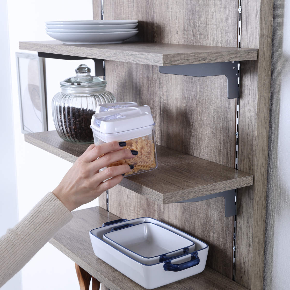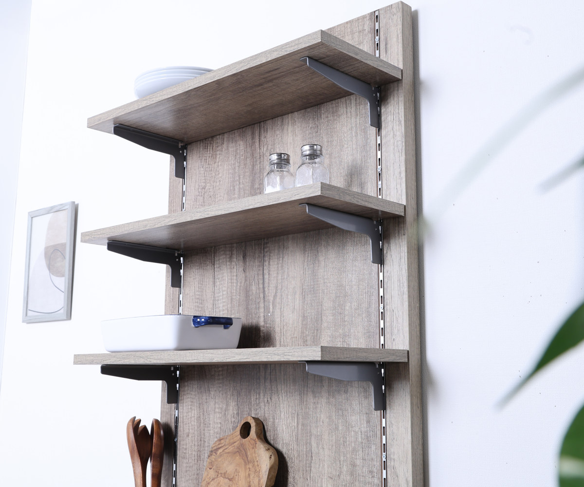 | 材質 | 本体:プリント紙化粧繊維板 スリット・棚受け:金属(鋼) 表面加工(スリット):めっき(クロム) 表面加工(棚受け):ポリエステル樹脂塗装 |