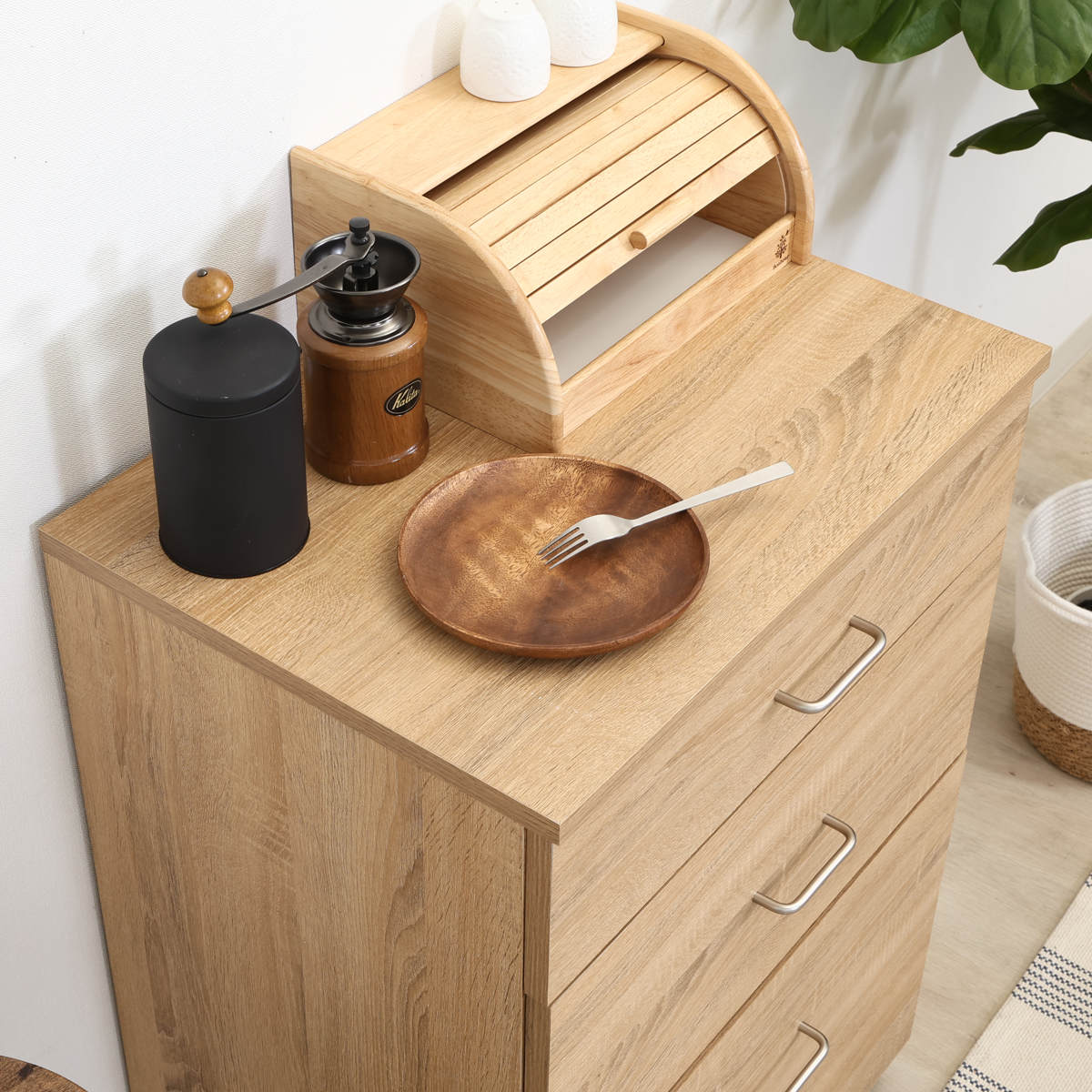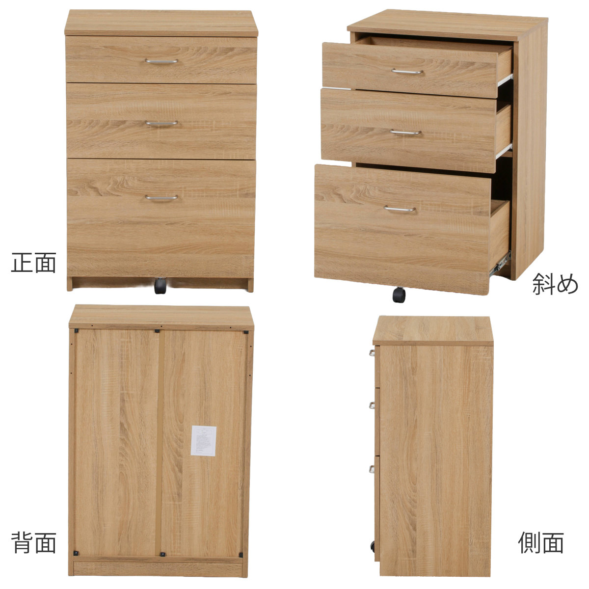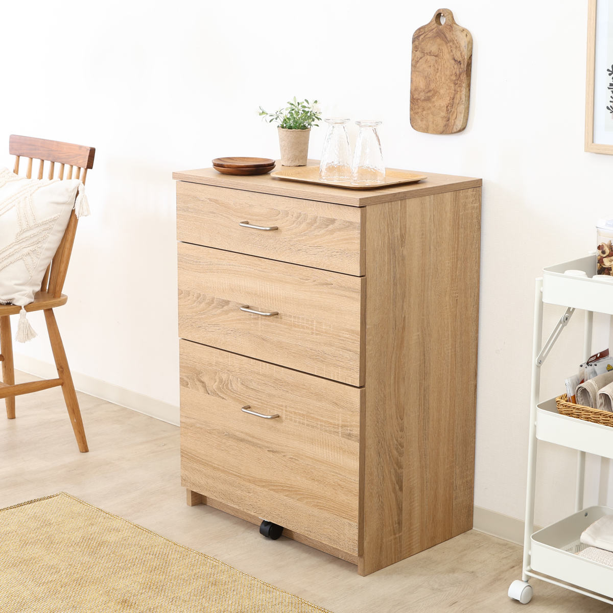 引き出し3杯を備えた、収納力と使い勝手に優れたチェストです。深さがそれぞれ異なる引出しは、収納物に合わせて使い分けができます。天板は作業台として使ったり、トースターなどの家電を置いたりできます。