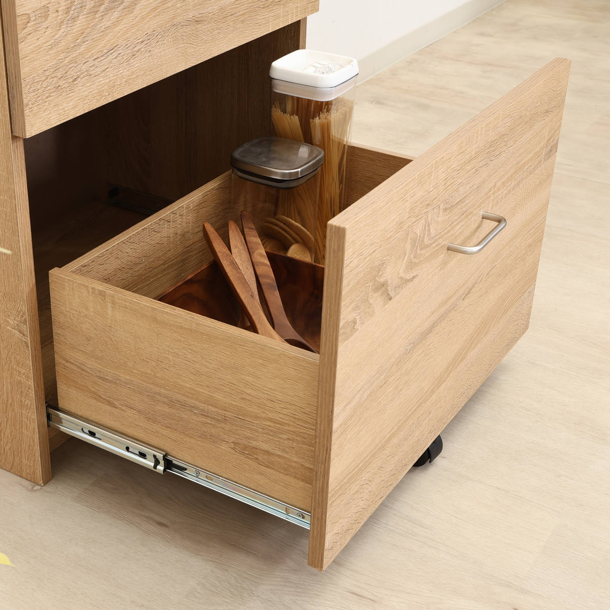 引出しには、食品ストックや食器などをスッキリと収納できます。最下段の深い引き出しは、中身が重くなりがちですが、キャスター&フルスライドレール仕様なので出し入れがしやすく、奥の物も取り出しやすいです。