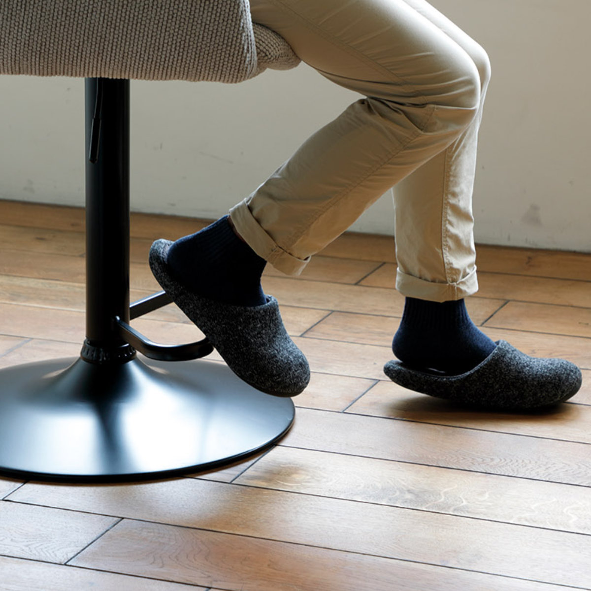 ハイチェアの脚部には足掛けがついているので、座面高に合わせて楽な体勢で座ることができます。また、安定感のある台座により、高さを調節してもぐらつきがなく、安心してお使いいただけます。