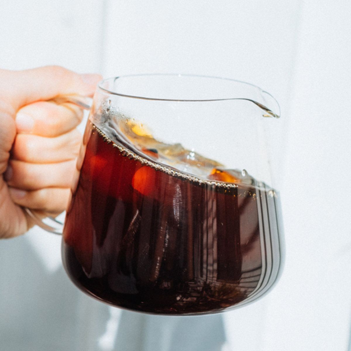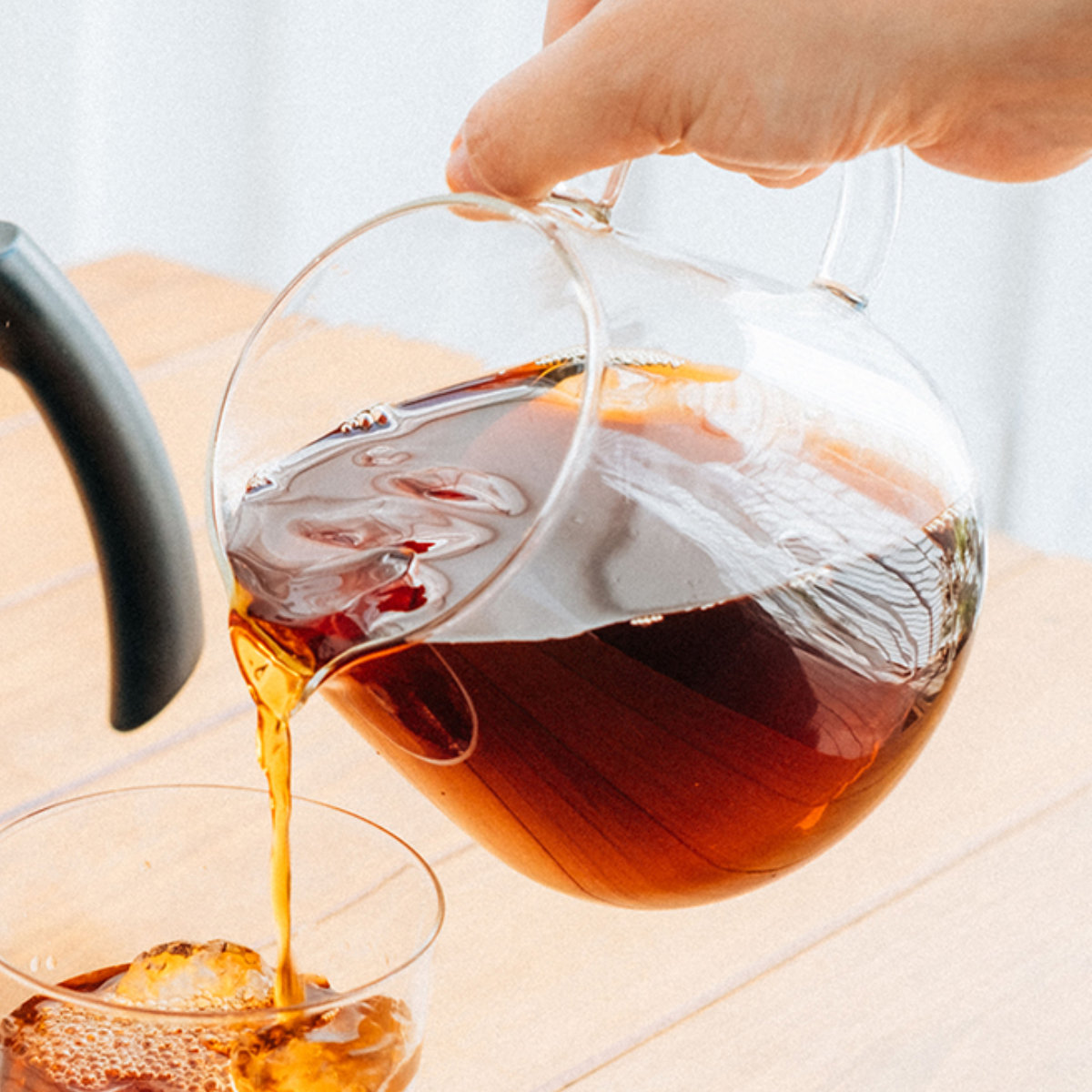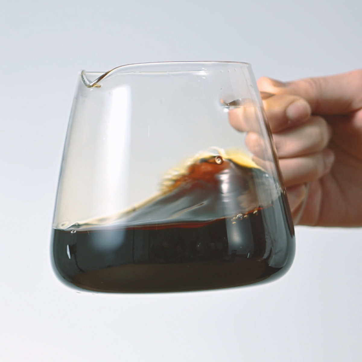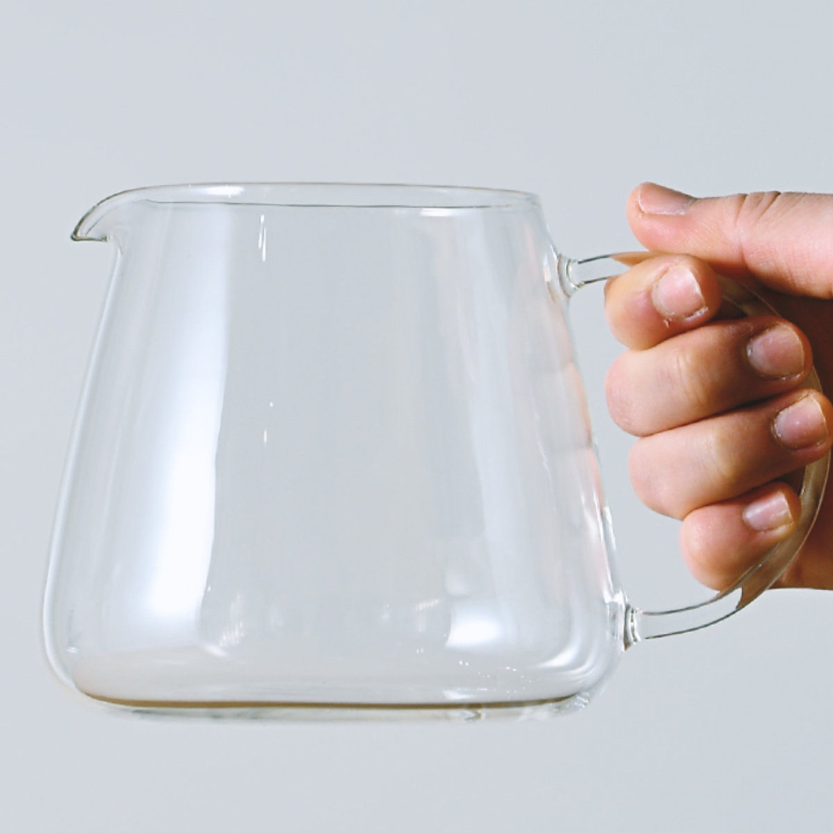 手にフィットする大きめハンドルで、持ちやすさと注ぎやすさを追求した設計です。耐熱ガラス製で中身の量が確認しやすく、注ぐときのコントロールも簡単です。