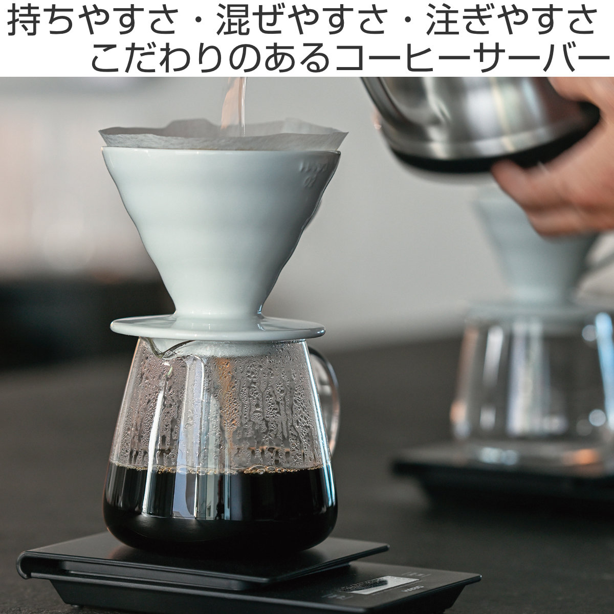 口径80mmの設計で、V60シリーズをはじめとするさまざまなドリッパーに対応します。複数のドリッパーを使い分けてもそのまま注げるので、抽出スタイルや豆の種類に応じた使い分けが可能です。