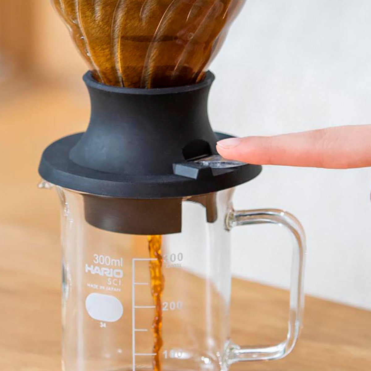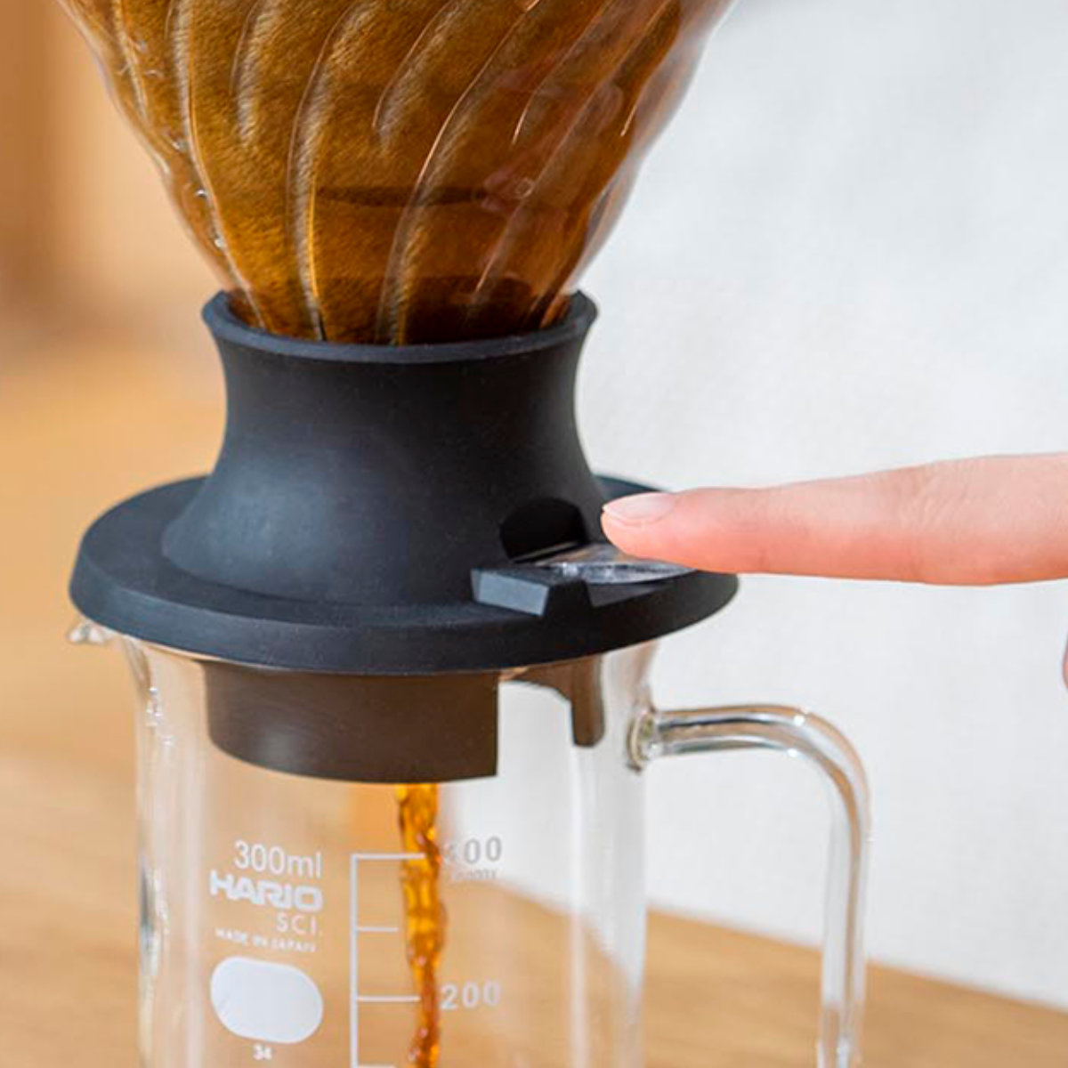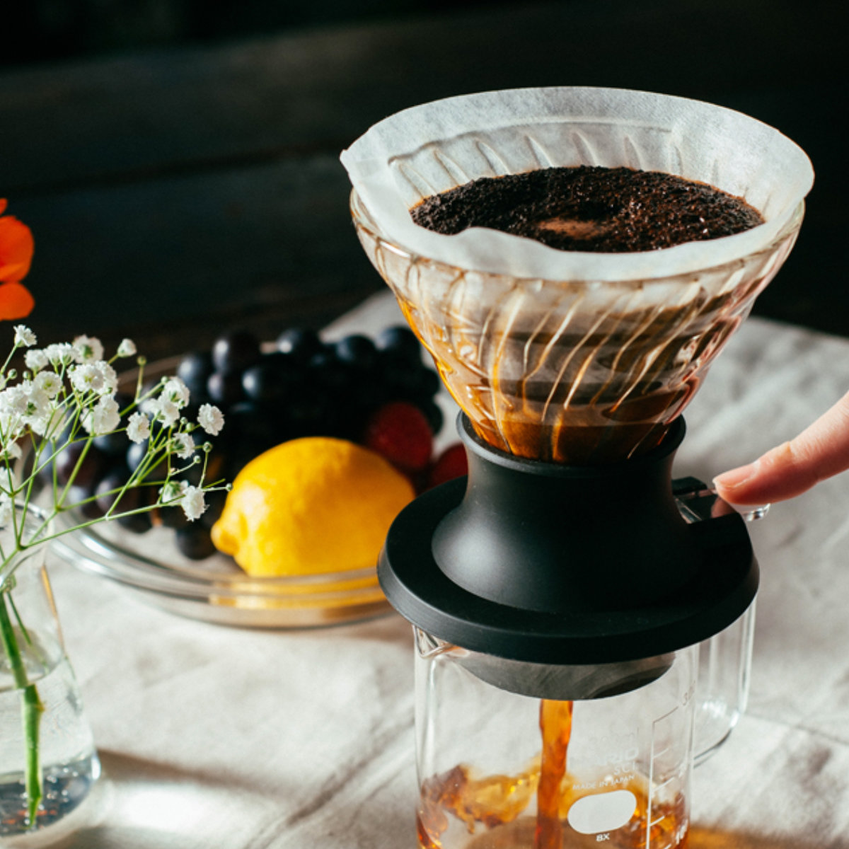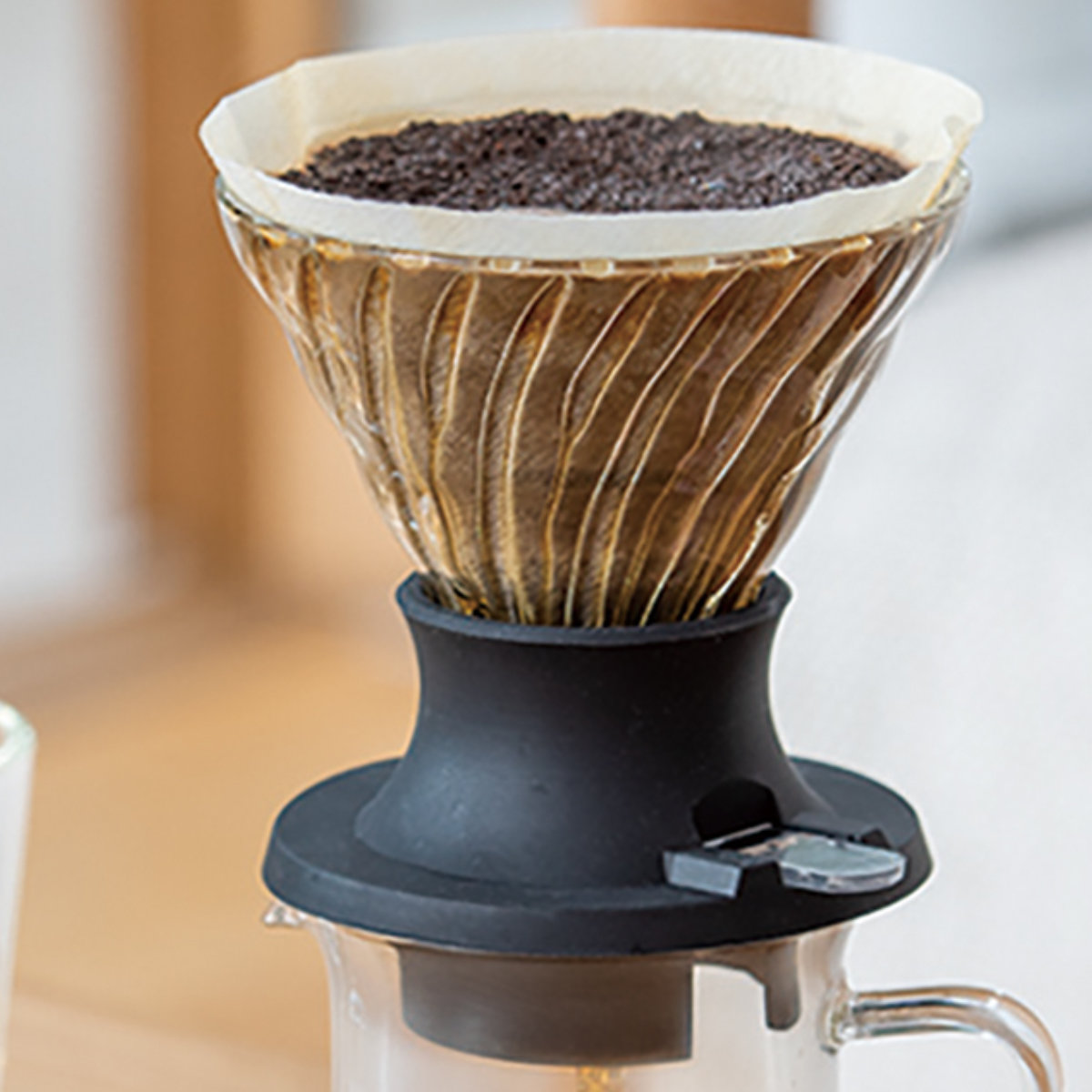 底部スイッチは、抽出の開始と停止を自在にコントロールできる浸漬式構造です。お湯を注いで待ち、スイッチを押すだけで、安定した美味しさを実現します。指を離しても最後までドリップできます。