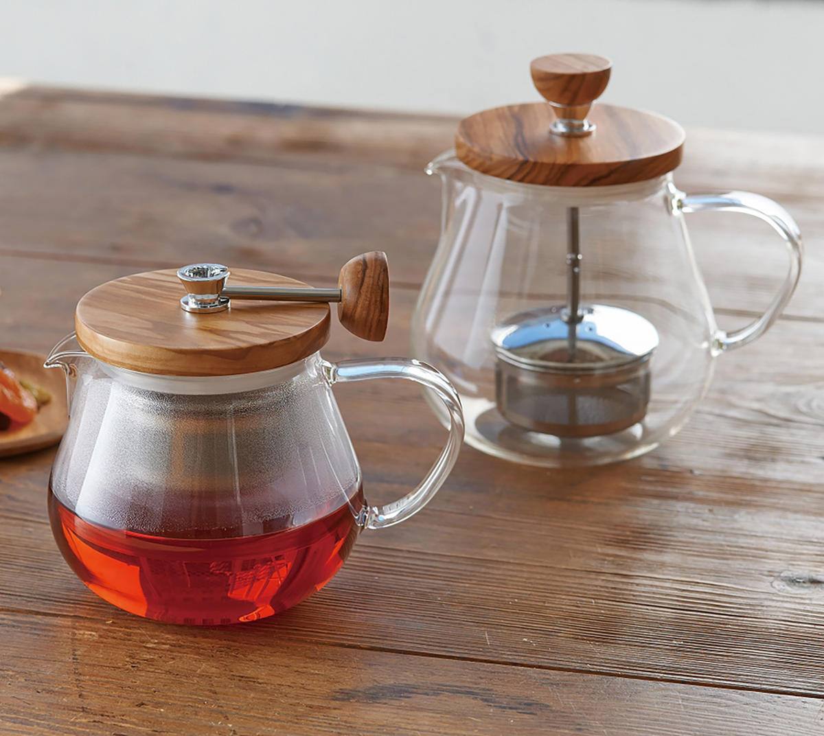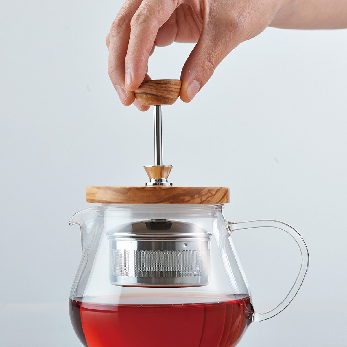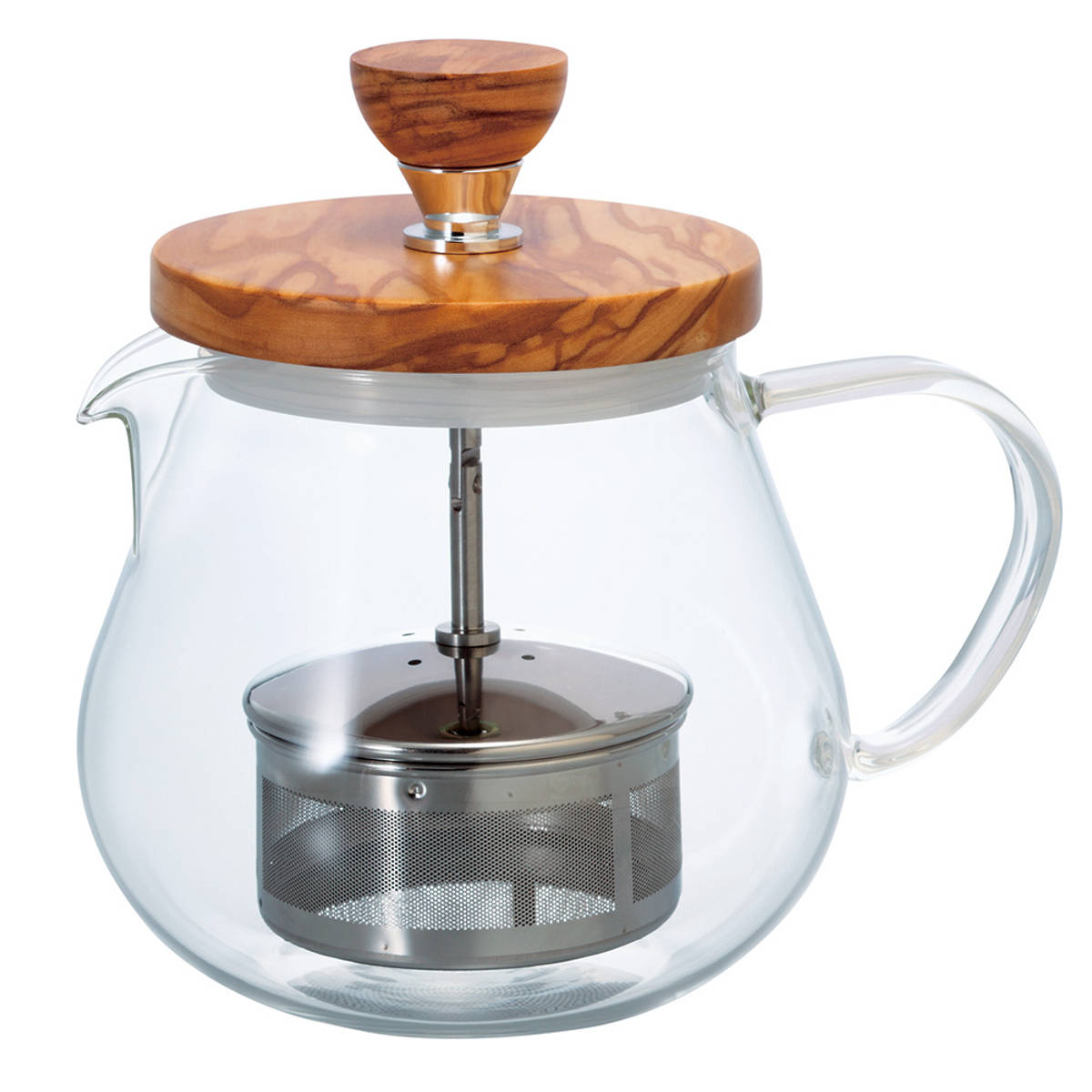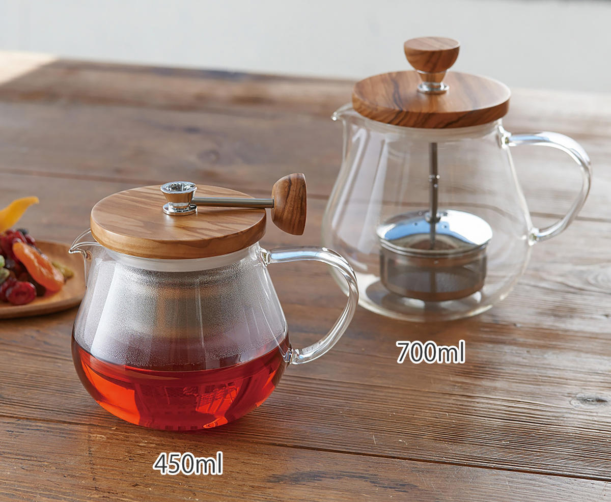 オリーブウッドのぬくもりとガラスの透明感が調和したティーポットです。本体は耐熱ガラス製で、熱湯も安心。自然な木の風合いがテーブルにやさしく馴染み、和洋どちらの食卓にもすっと溶け込みます。2~3人分にちょうど良い450mlサイズです。