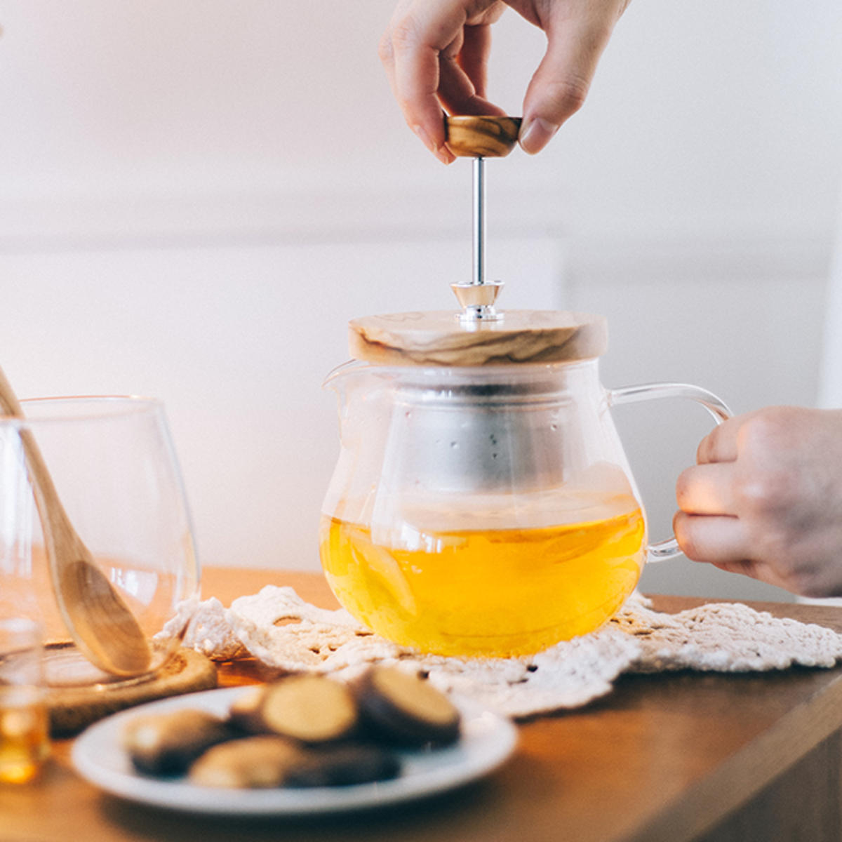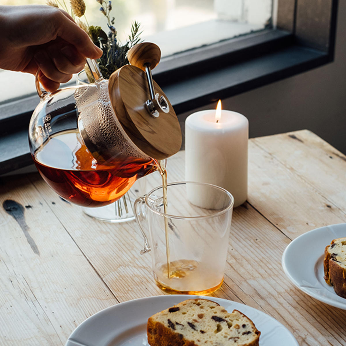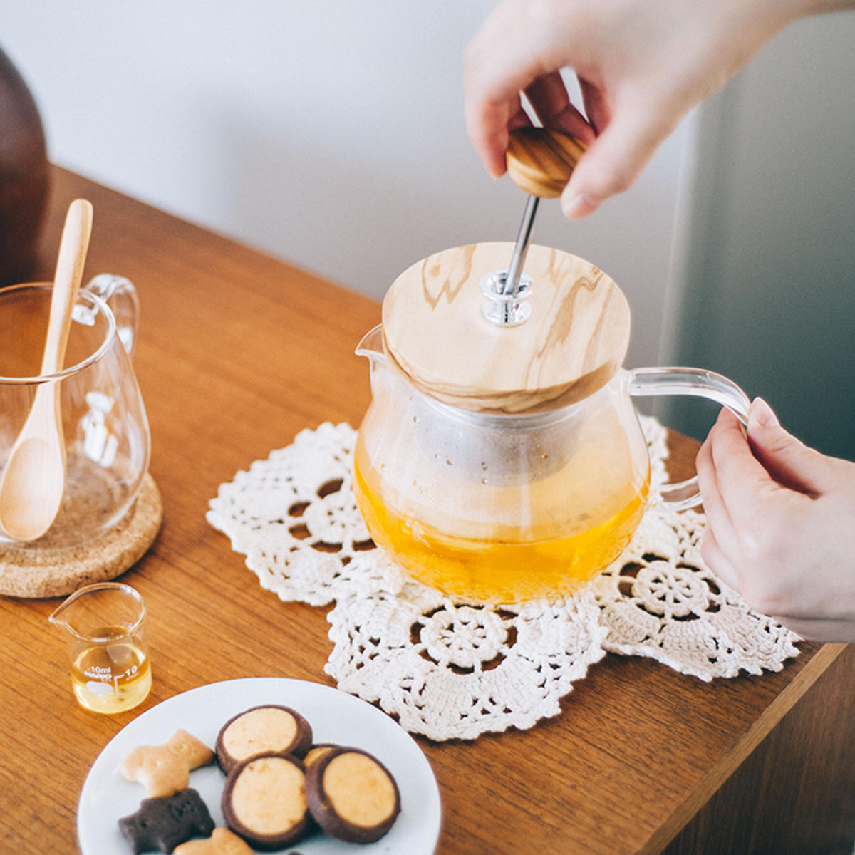 オリーブウッドのぬくもりとガラスの透明感が調和したティーポットです。本体は耐熱ガラス製で、熱湯も安心。自然な木の風合いがテーブルにやさしく馴染み、和洋どちらの食卓にもすっと溶け込みます。2~3人分にちょうど良い450mlサイズです。