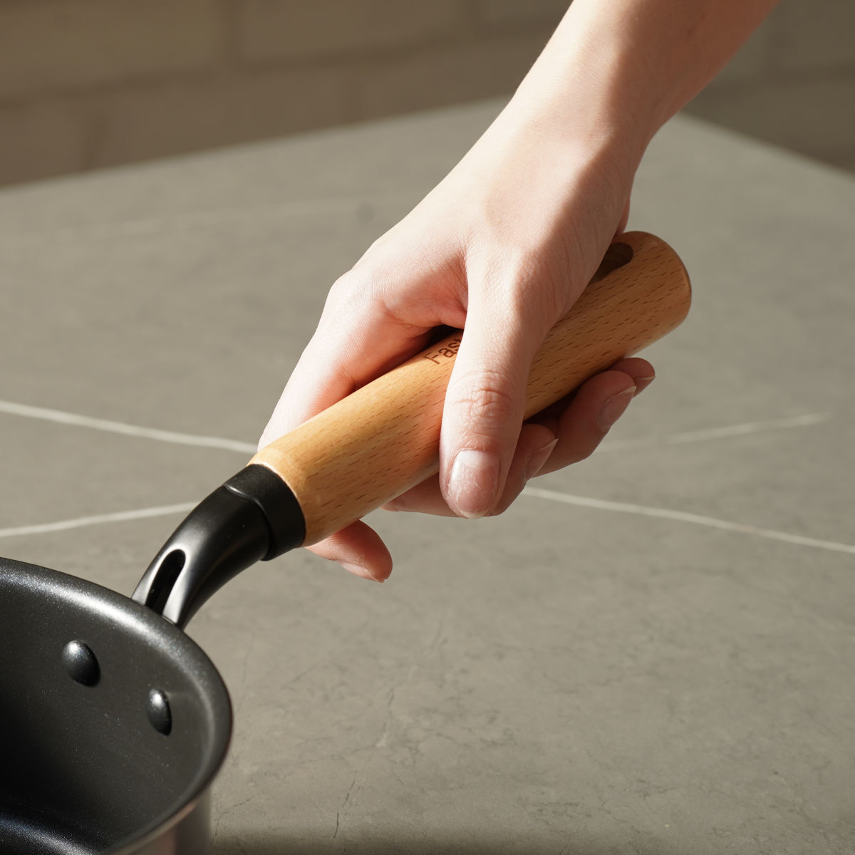 ハンドルには天然木を使用しています。上質なデザインかつ肌触りがよく手になじみます。