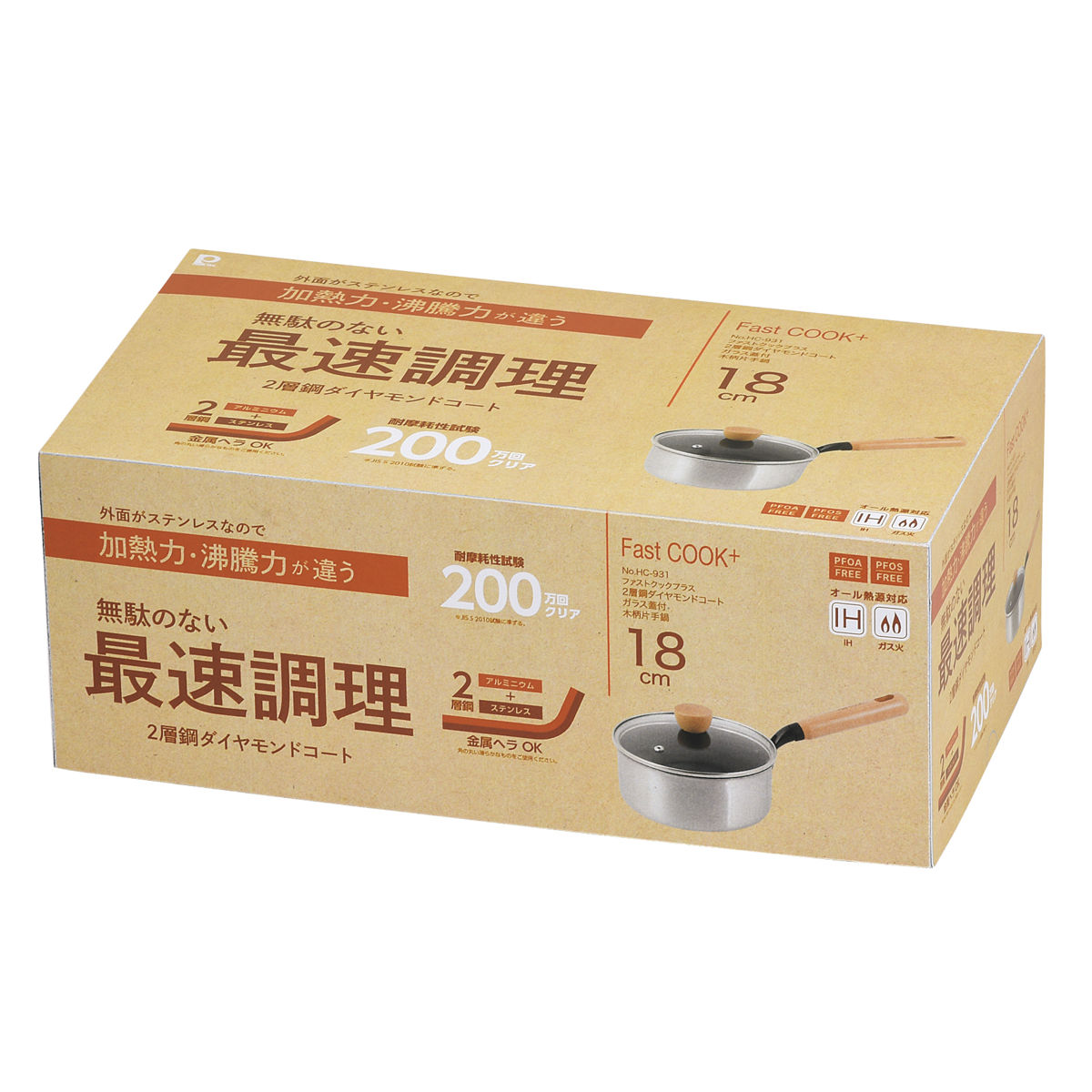 片手鍋 18cm IH対応 ガラス蓋付き ファストクック+ 2層鋼ダイヤモンドコート ( ガス火対応 オール熱源対応 片手なべ 鍋 ふっ素加工 軽い 18センチ アルミ鍋 調理鍋 フッ素加工 ガラス蓋 ステンレス アルミ 2層構造 木柄 )