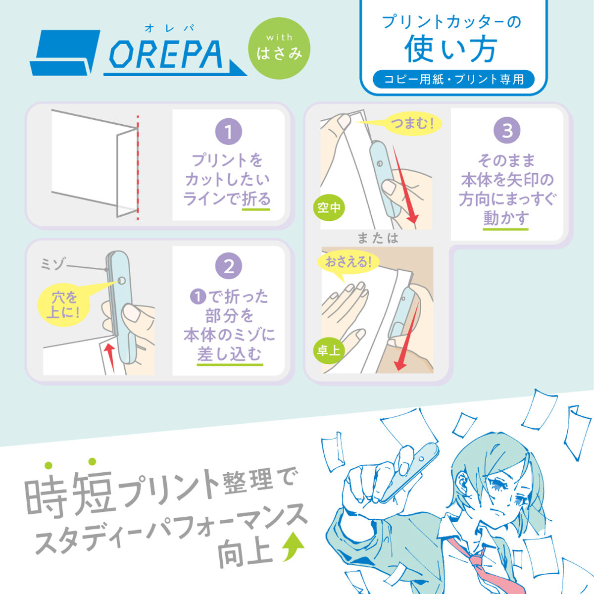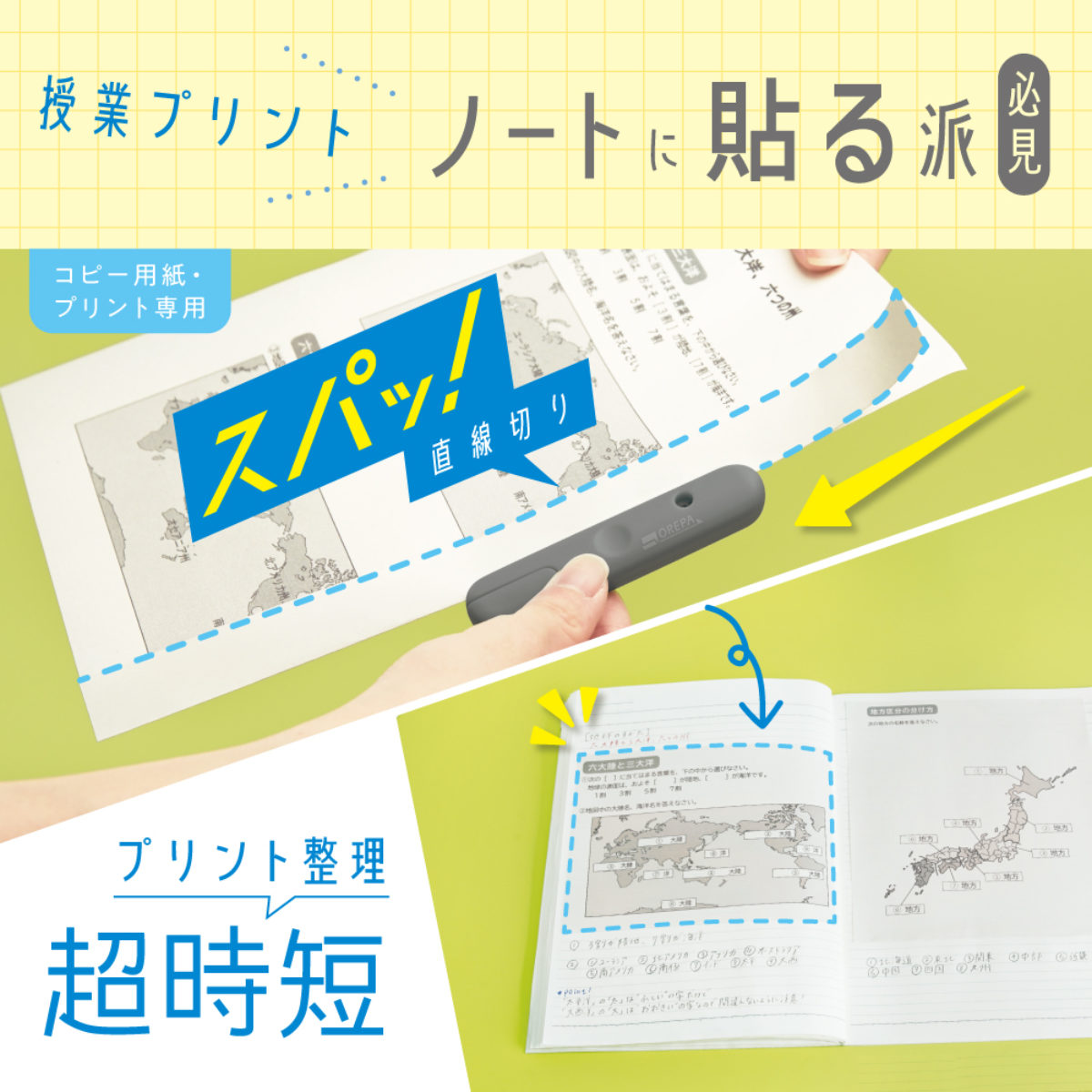 授業プリントをノートにきれいに貼るためのプリントカッターです。プリント整理の手間を減らし、作業をスムーズにします。