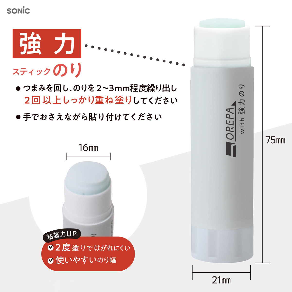 付属の強力スティックのりは2度塗りするとよりはがれにくく、しっかり貼れる粘着力が特長です。
