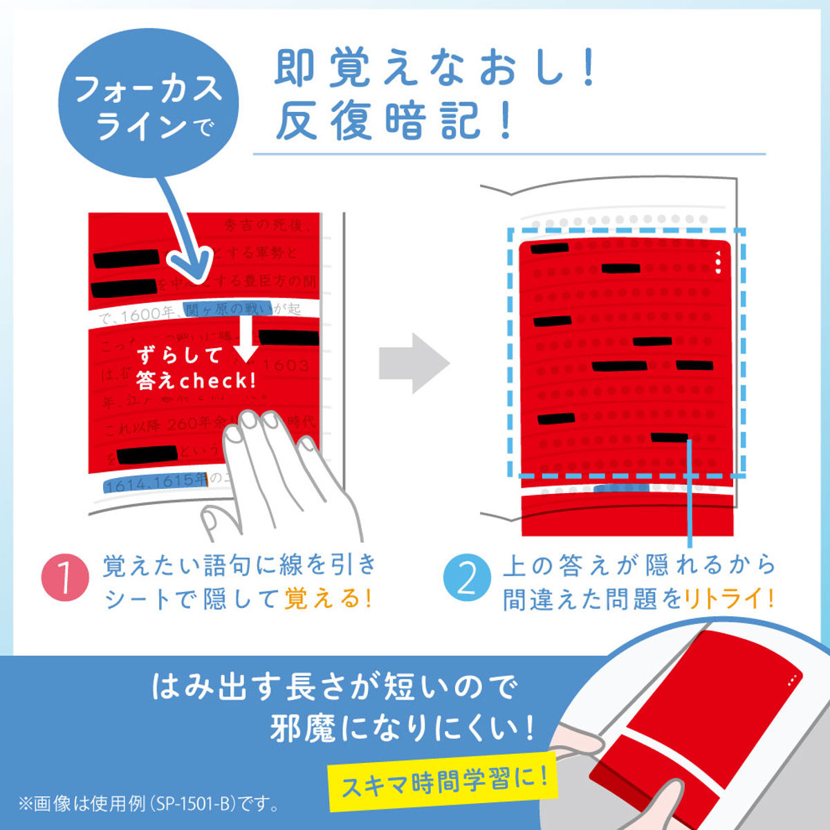 確認したいところだけが見えるフォーカスライン入りのシートです。効率的に繰り返し確認できるので、反復暗記にもぴったりです。