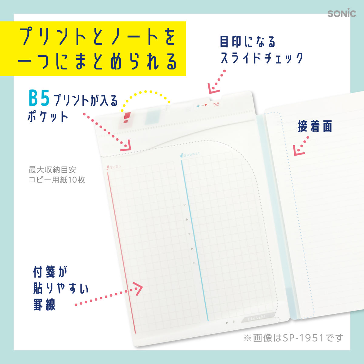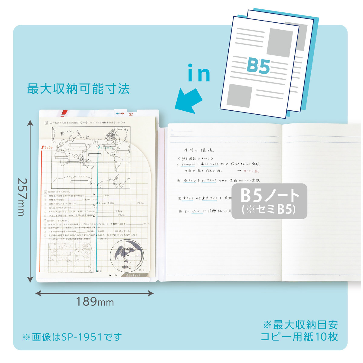お手持ちのB5ノートに貼り付けられます。ファイルのポケットはB5サイズの用紙を10枚まで収納できます。
